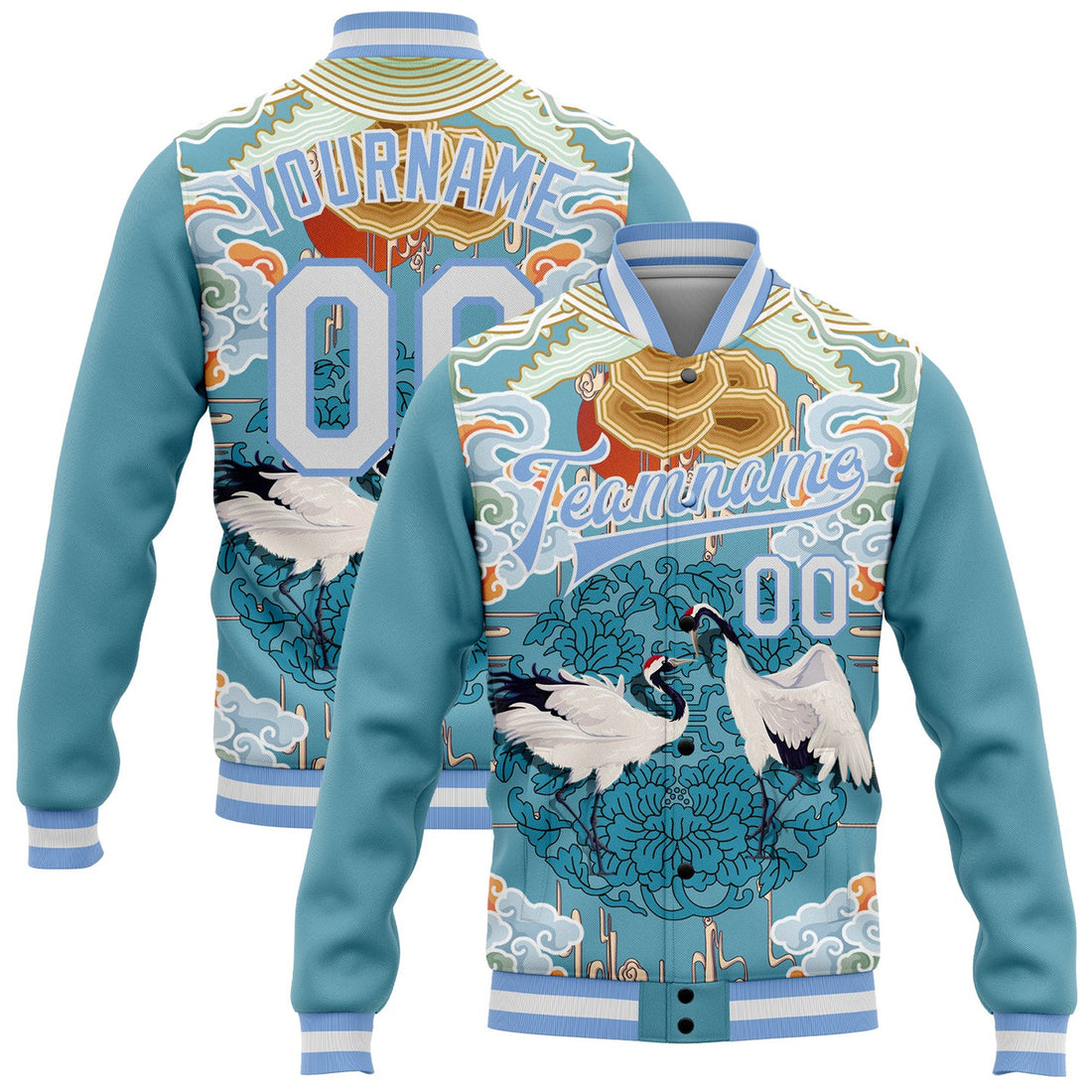 FUNSTUFFPRINT Custom Light Blue White Heron And Cloud 3D Pattern Design Bomber Full-Snap Varsity Letterman Jacket 3D Baseball Jacket