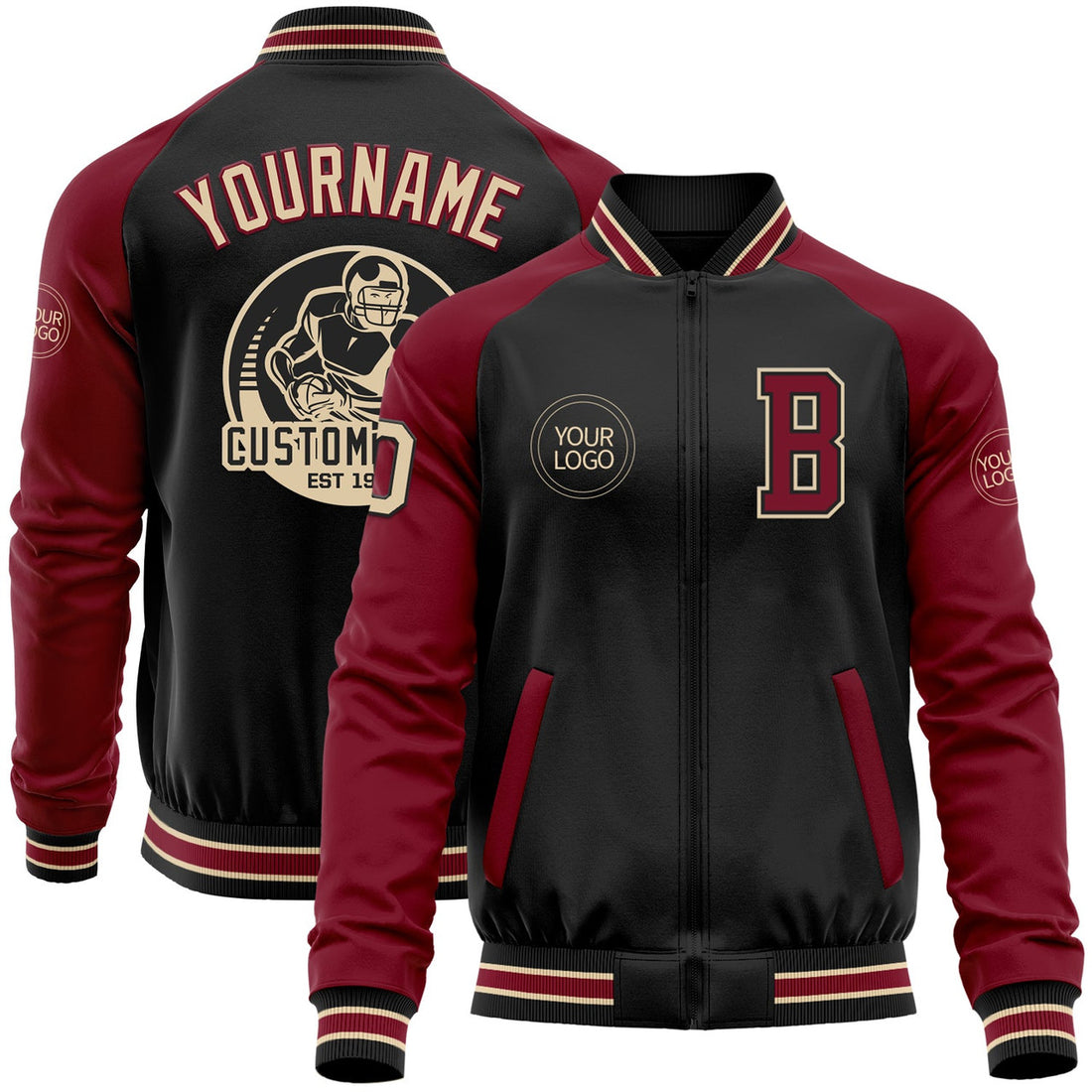 FUNSTUFFPRINT Custom Black Crimson-Cream Bomber Full-Snap Varsity Letterman Two Tone Jacket 3D Baseball Jacket