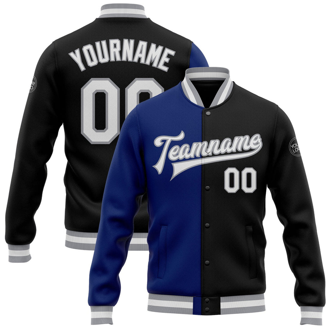 FUNSTUFFPRINT Custom Black White Royal-Gray Bomber Full-Snap Varsity Letterman Split Fashion Jacket 3D Baseball Jacket