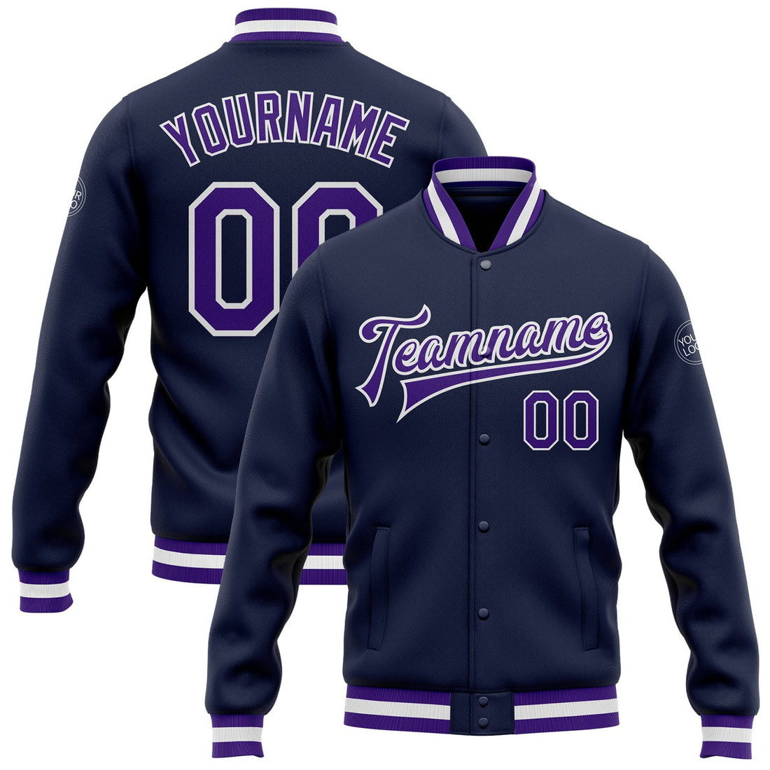 FUNSTUFFPRINT Custom Navy Purple-White Bomber Full-Snap Varsity Letterman Jacket 3D Baseball Jacket