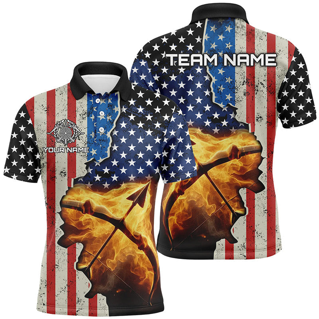 FUNSTUFFPRINT Personalized Retro USA Flag Men Archery Polo Shirts, Patriotic US Archery Jerseys For Team Archer Polo Shirt Size S-5XL