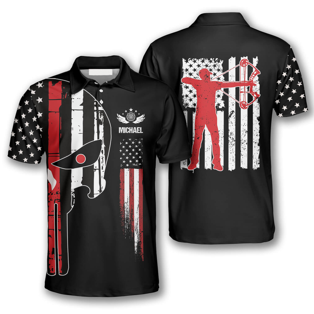 Custom Punisher Skull American Flag American Custom Archery Polo Shirts for Men, Flag Shirt, Archery Shirt