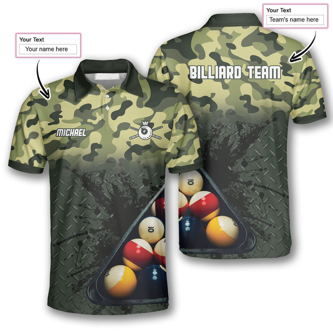 Personalized Green Camo Custom Billiard Shirts for Men, Billiard Polo Shirt, Gift for Team Billiard