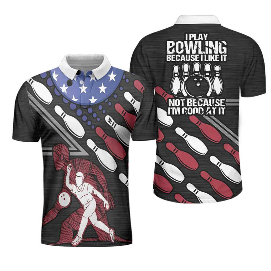 I Play Bowling Because I Like It Not Because I'M Good At It Polo Shirt, American Flag Bowling Shirt For Men