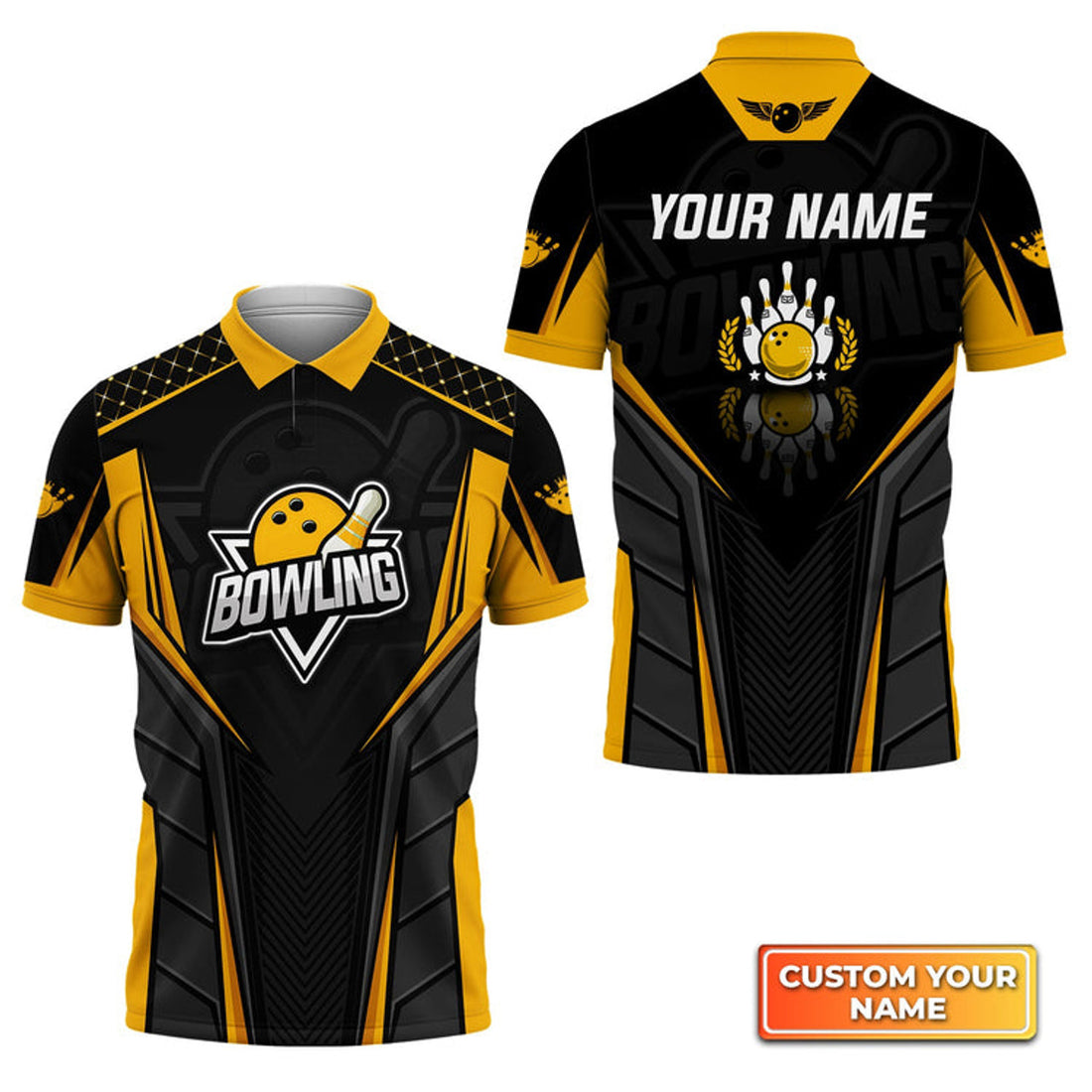 Custom Bowling Pattern And Golden Polo Custom Polo Shirt, Black Personalized Bowling Shirt With Name, Bowling Gift Idea