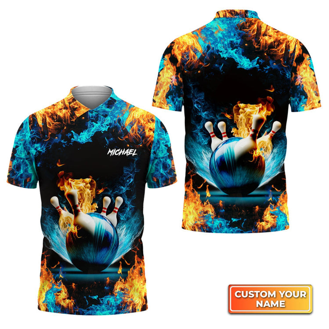 Custom The Blue Bowling Ball in Flames Breaks White Skittles Personalized Name 3D Polo Shirt