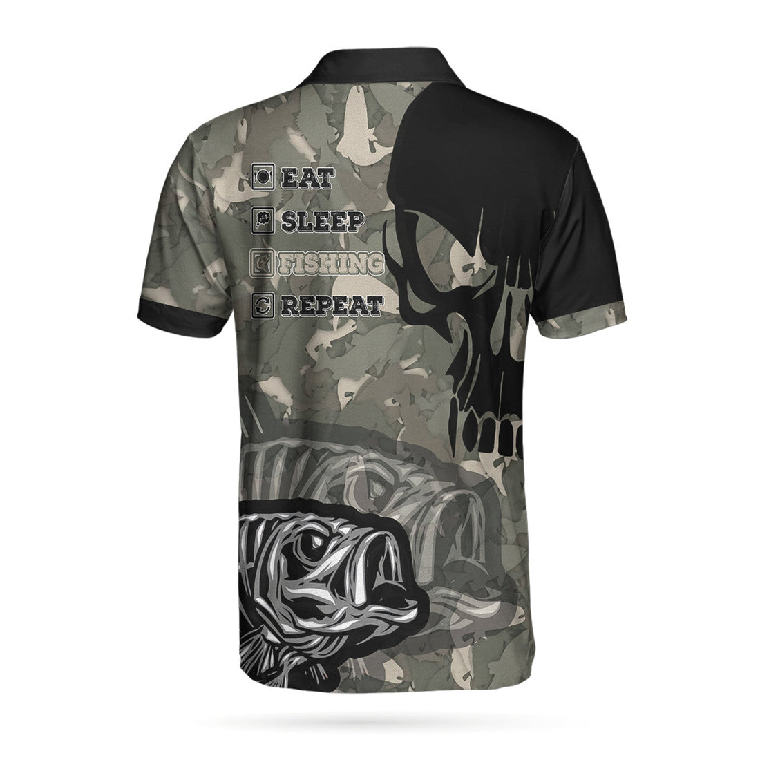 Fish Reaper Men Polo Shirt, Eat Sleep Fishing Repeat Skull Camouflage Polo Shirt, Camo Fishing Shirt For Men