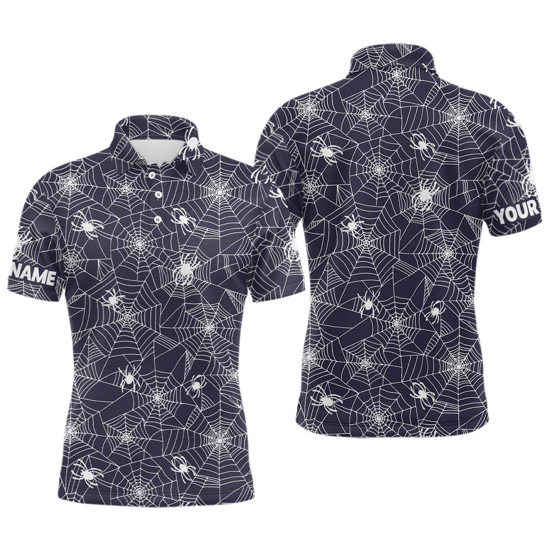 FUNSTUFFPRINT Spooky White Spiders On Cobweb Navy Halloween Golf Polo Shirt Size S-5XL