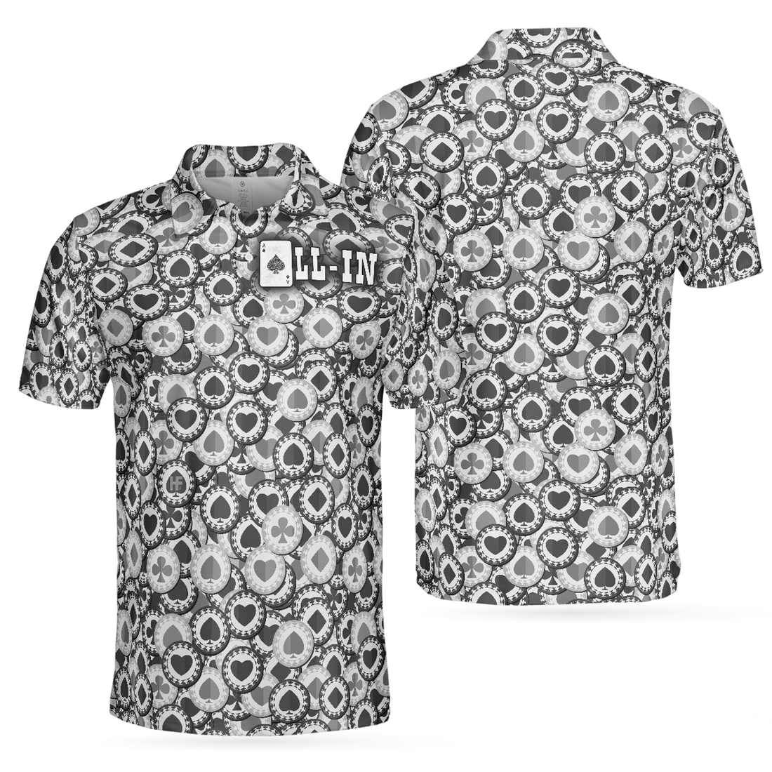 Poker All In Short Sleeve Polo Shirt, Black And White Poker Chip Pattern Polo Shirt, Best Poker Shirt For Men