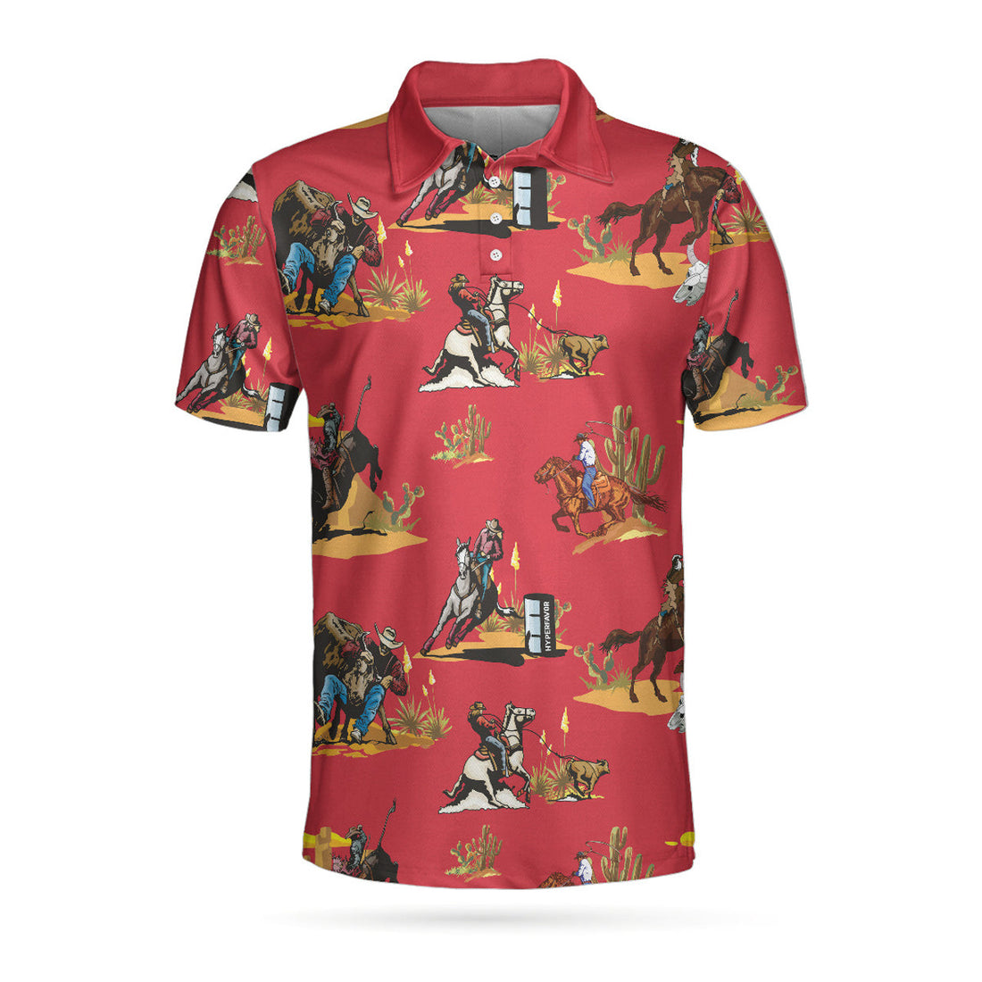 Rodeo Seamless Pattern Short Sleeve Polo Shirt, Red Texas Cowboy Polo Shirt, Rodeo Shirt For Men