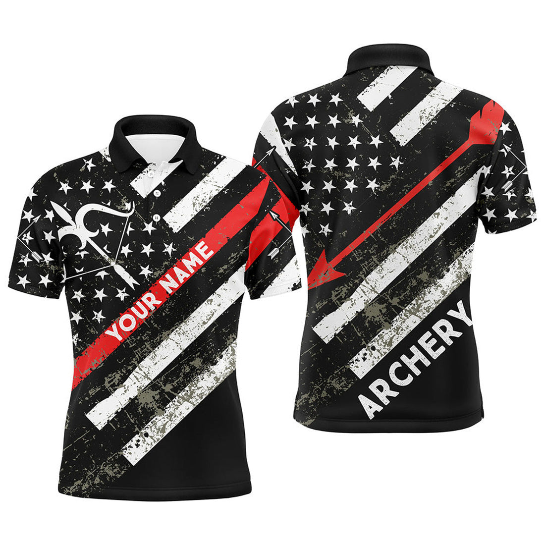 Personalized Grunge American Flag Bow Archery Polo Shirts For Men, Custom Arrow Archery Shirts