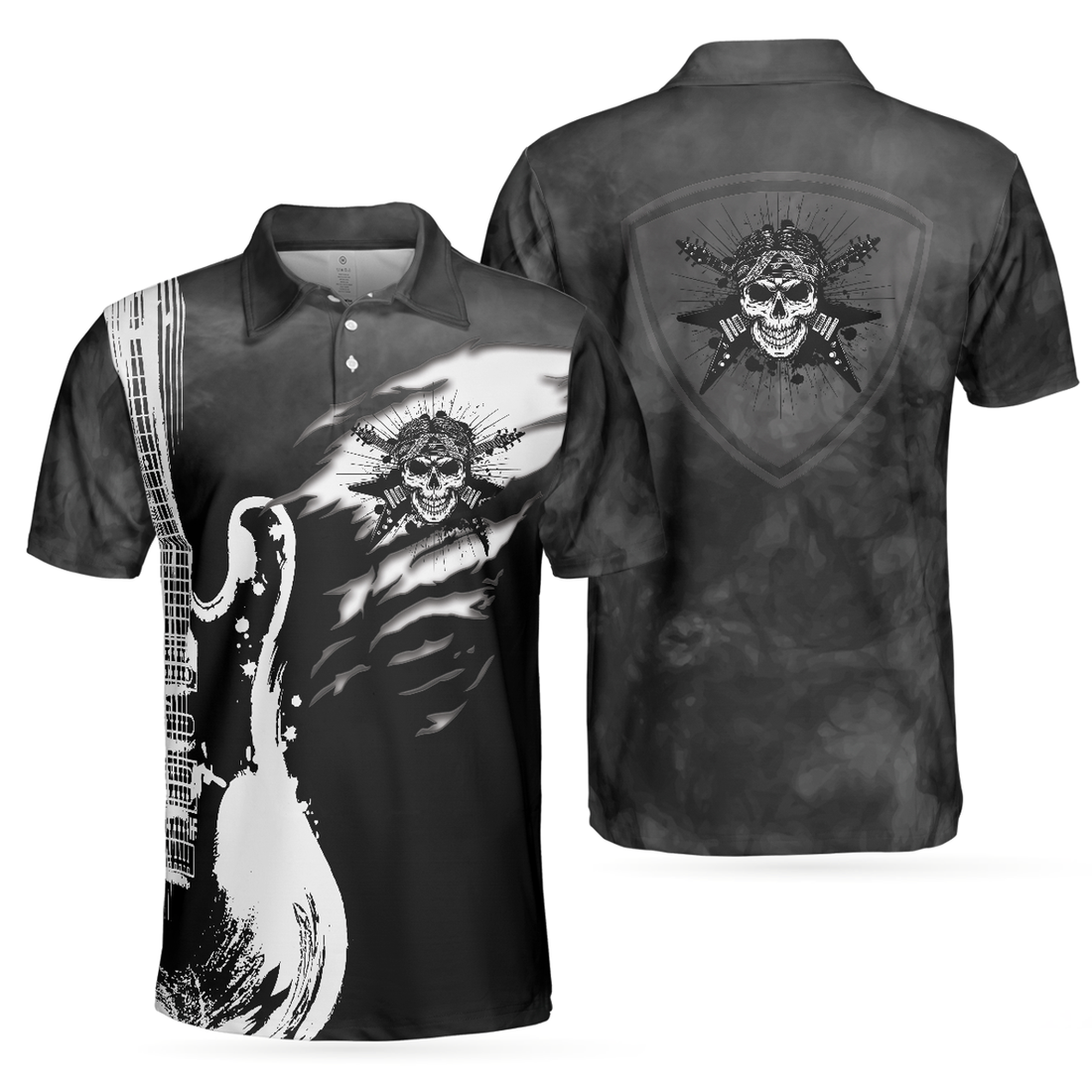 Guitar And Skull Short Sleeve Polo Shirt, Streetwear Polo Shirt, Black And White Guitar Shirt For Men