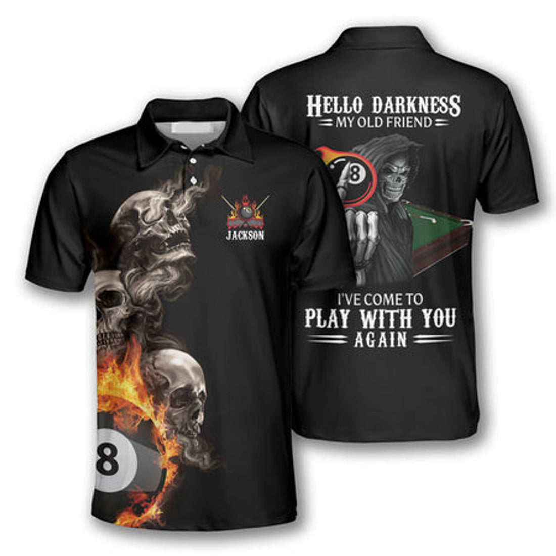 Custom Billiards Hello Darkness My Old Friend Custom Billiard skull Shirts for Men, Custom Billiard 8 ball for Team, Billiard Polo Shirts