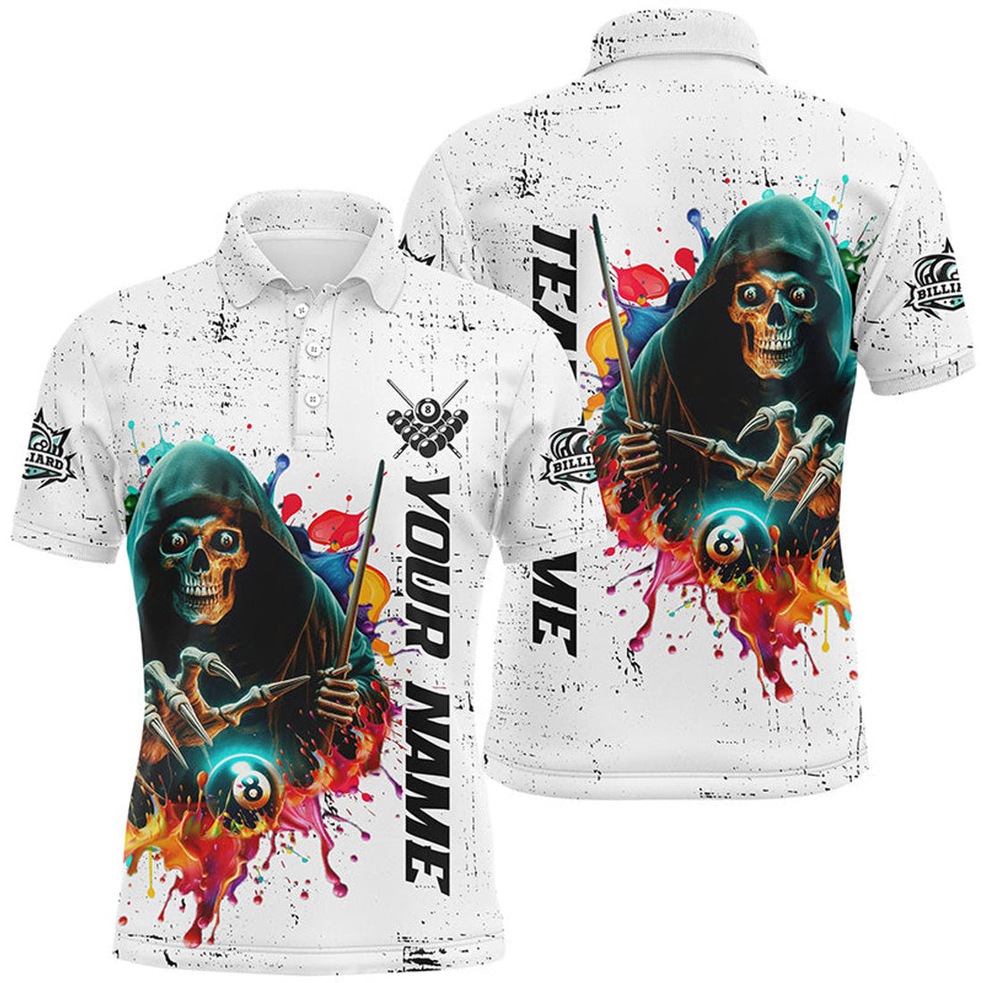 Custom Billiard Skeleton Colorful Grunge Style Personalized Men Polo Shirts, Best Billiard Attire Design