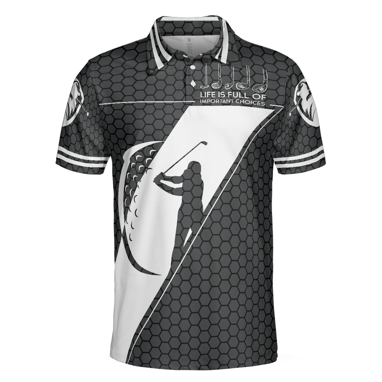 Black Golfing Pattern Men Polo Shirt, Life Is Full Of Important Choices Golf Polo Shirt, Best Golf Shirt For Men