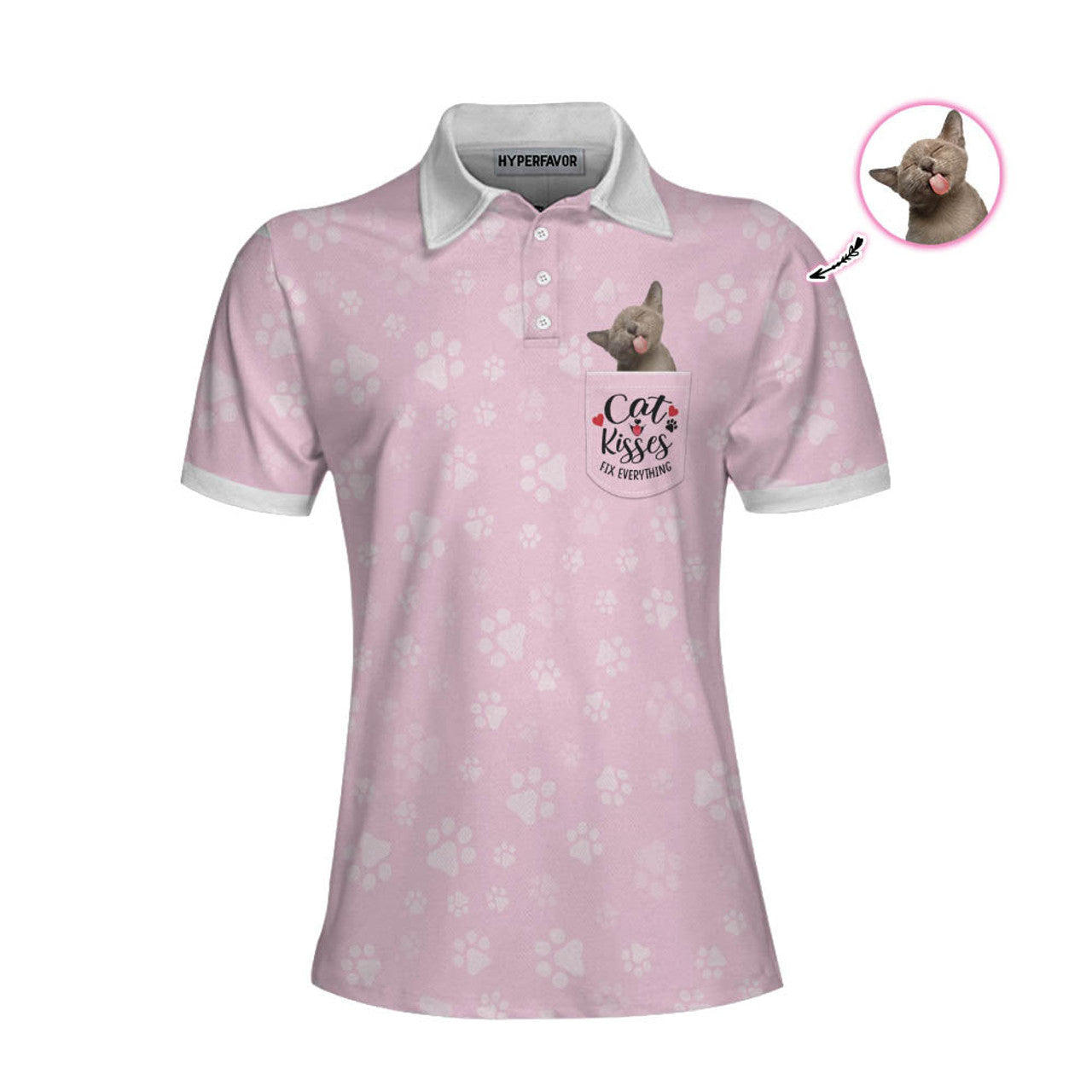 Cat Kisses Fix Everything Custom Short Sleeve Women Polo Shirt, Personalized Cat Polo Shirt For Women, Pink Cat Mom Shirt