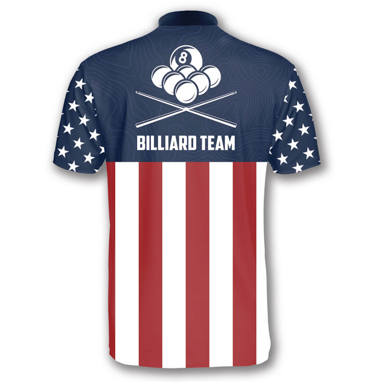 Custom 8 Ball Patriotic Flag Navy Custom Billiard Jerseys for Men, Uniform Shirt for Billiard Player, Flag Zipper Polo Shirt