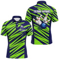 Custom Blue And Green Strike Bowling Polo, Quarter Zip Shirts For Men, Custom Name Bowling Team Jerseys