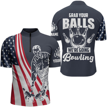 Custom Bowling shirts for men American flag patriotic Bowling Ball & Pins men Quarter Zip