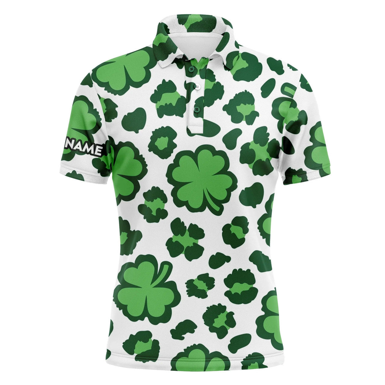 Custom Golf Men Polo Shirt - Custom Name Clover And Leopard Pattern St. Patrick's Day Apparel - Personalized Gift For Golf Lover, Men, Husband, Team