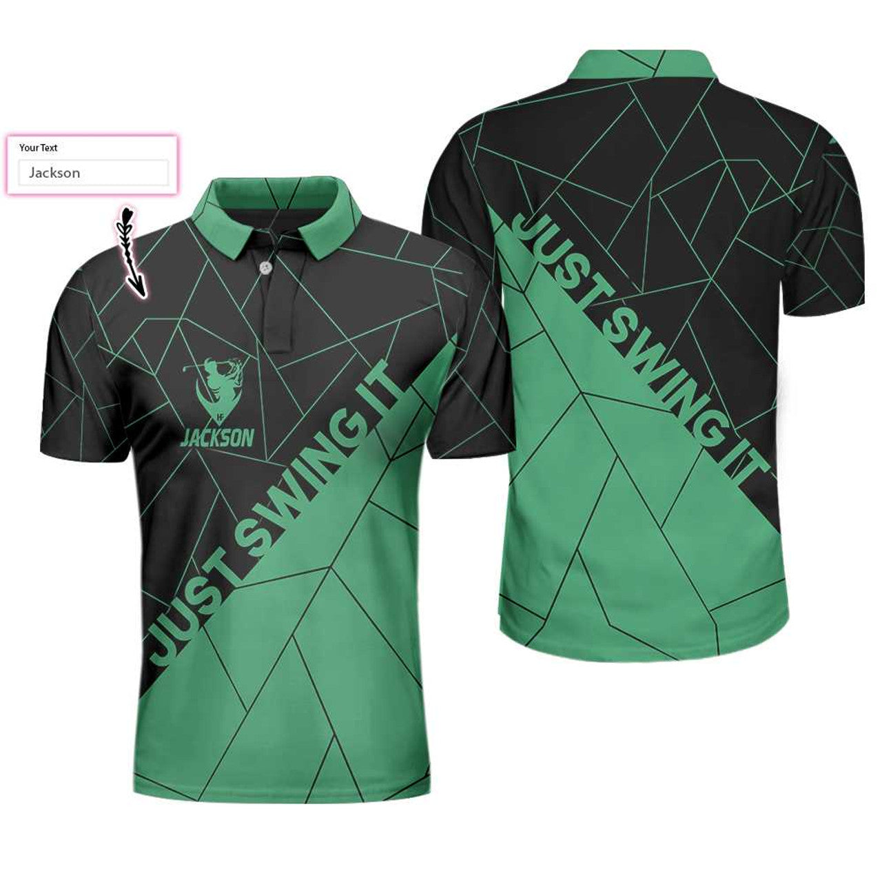 Custom Just Swing It Abstract Geometric Line Pattern Custom Polo Shirt, Personalized Black And Cyan Golf Shirt For Men