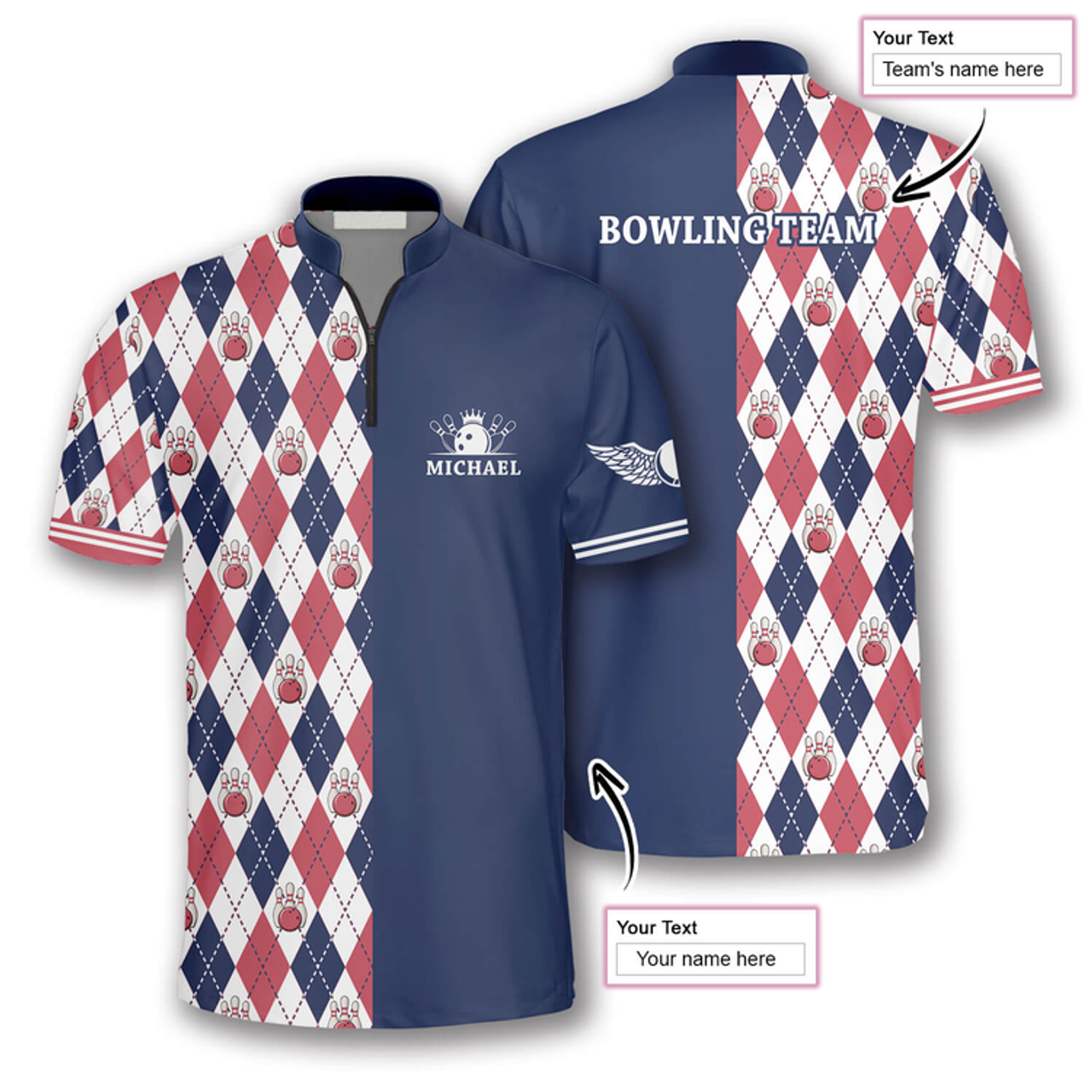 Custom Rhombus Pattern Custom Bowling Jerseys for Men, Personalized Zipper Polo Shirt Bowling Shirt