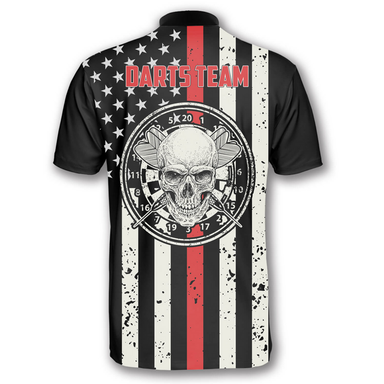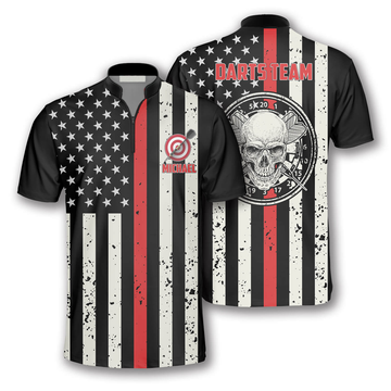 Custom Skull Flag Red Line Custom Darts Jerseys for Men, Zipper Polo Shirt for Dart Player