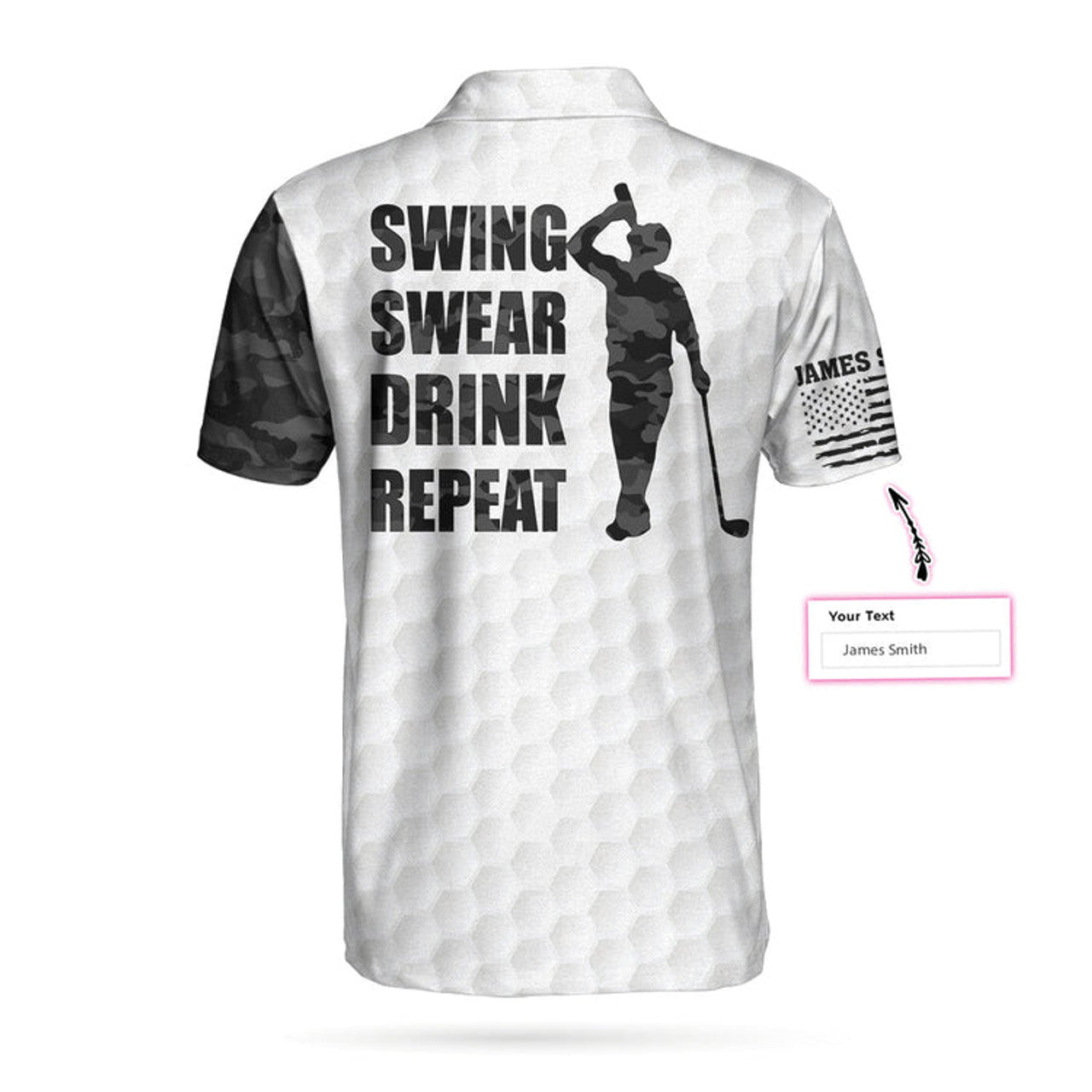 Custom Swing Swear Drink Repeat Ripped Camouflage Skull Golf Custom Polo Shirt, Personalized Black And White Golf Shirt For Men