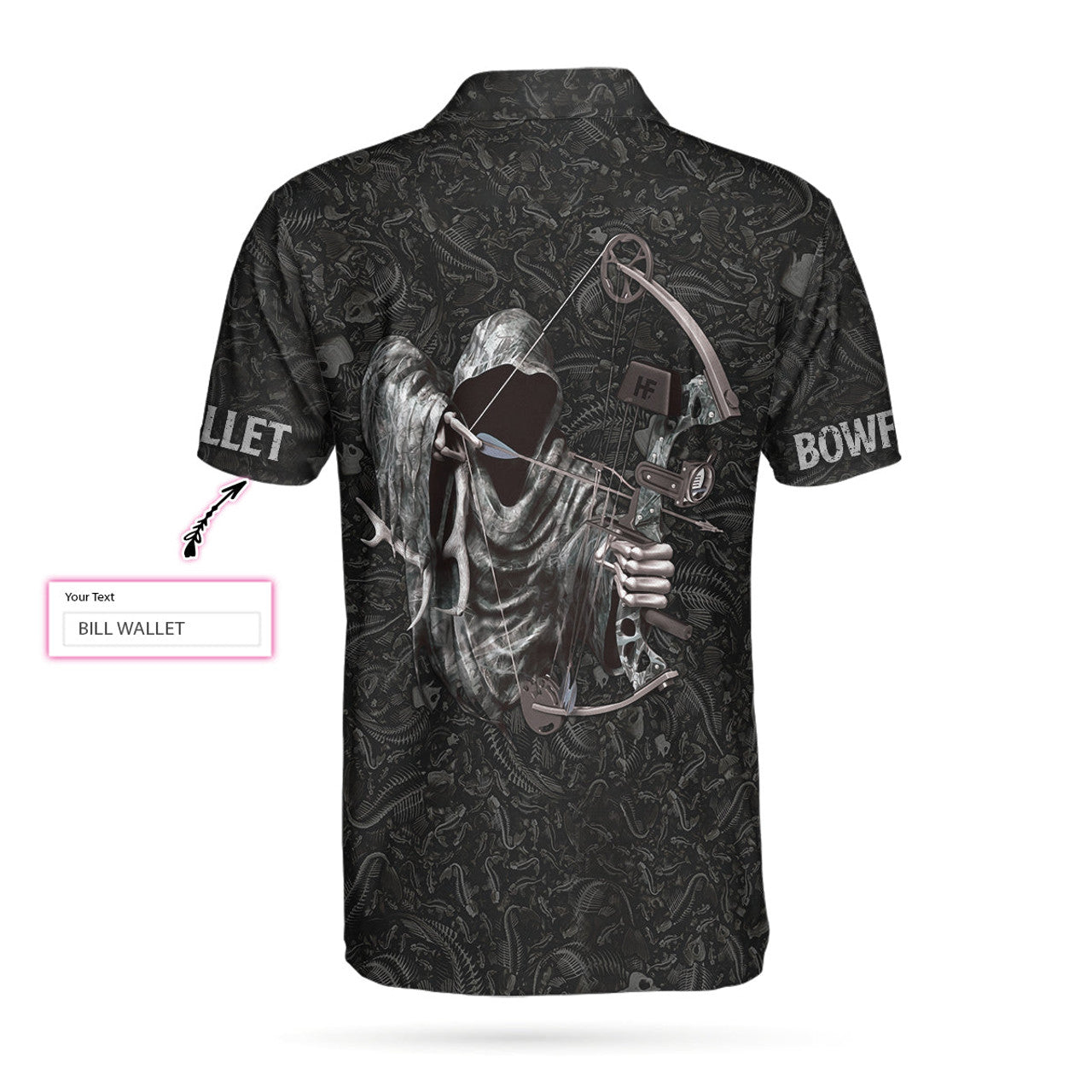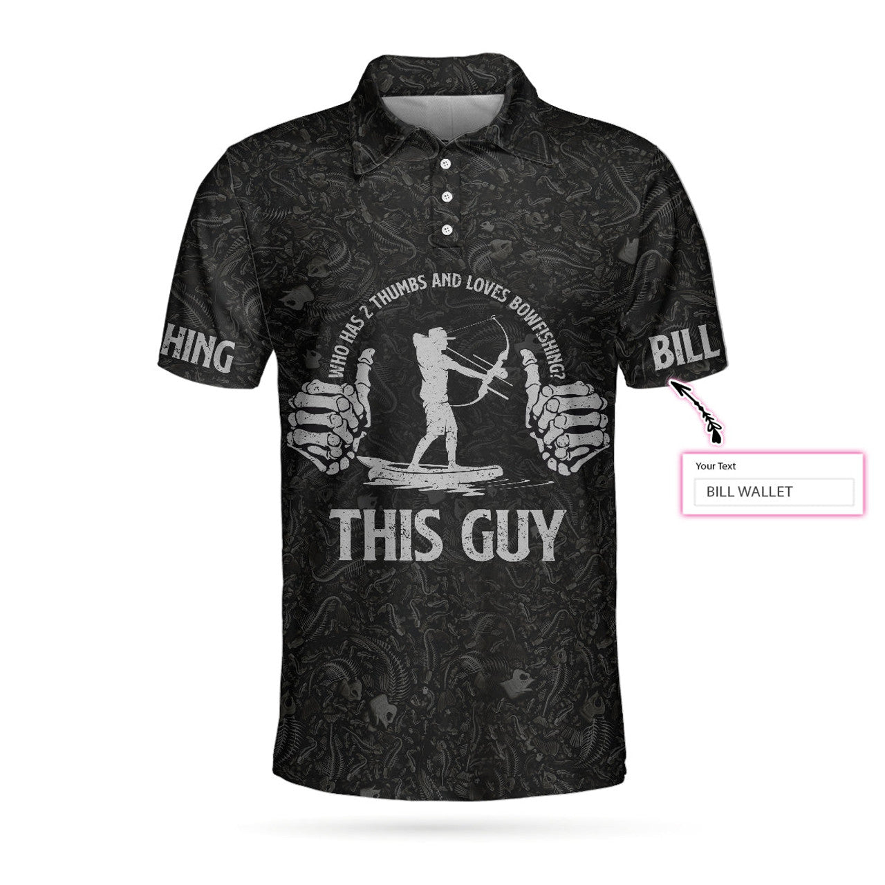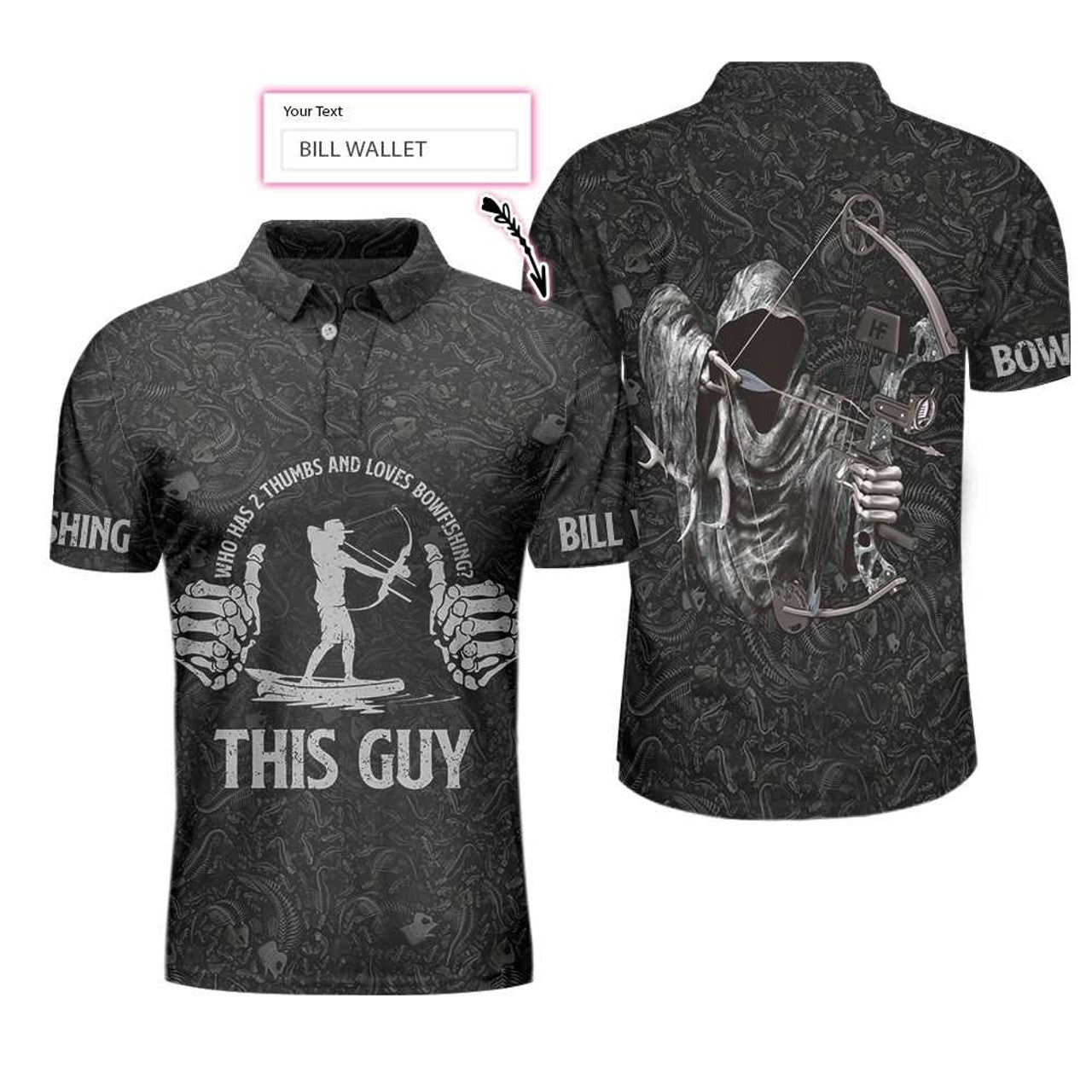Custom Who Has 2 Thumbs And Loves Bowfishing Custom Polo Shirt, Fish Skeleton Pattern Archer Reaper Polo Shirt, Best Fishing Shirt - Perfect Gift For Men