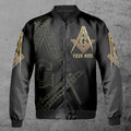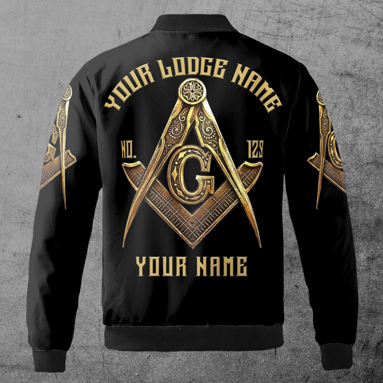 Customize Name, Lodge Name and Number Black and Gold Freemason Unisex Bomber Jacket S-5XL