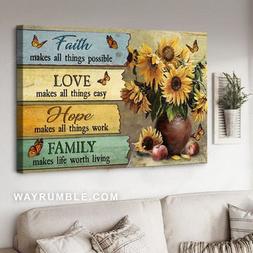 Faith Makes All Things Possible Love Makes All Things Easy Hope Makes All Things Work Family Make Life Worth Living Sunflowers Butterflies Poster and Canvas