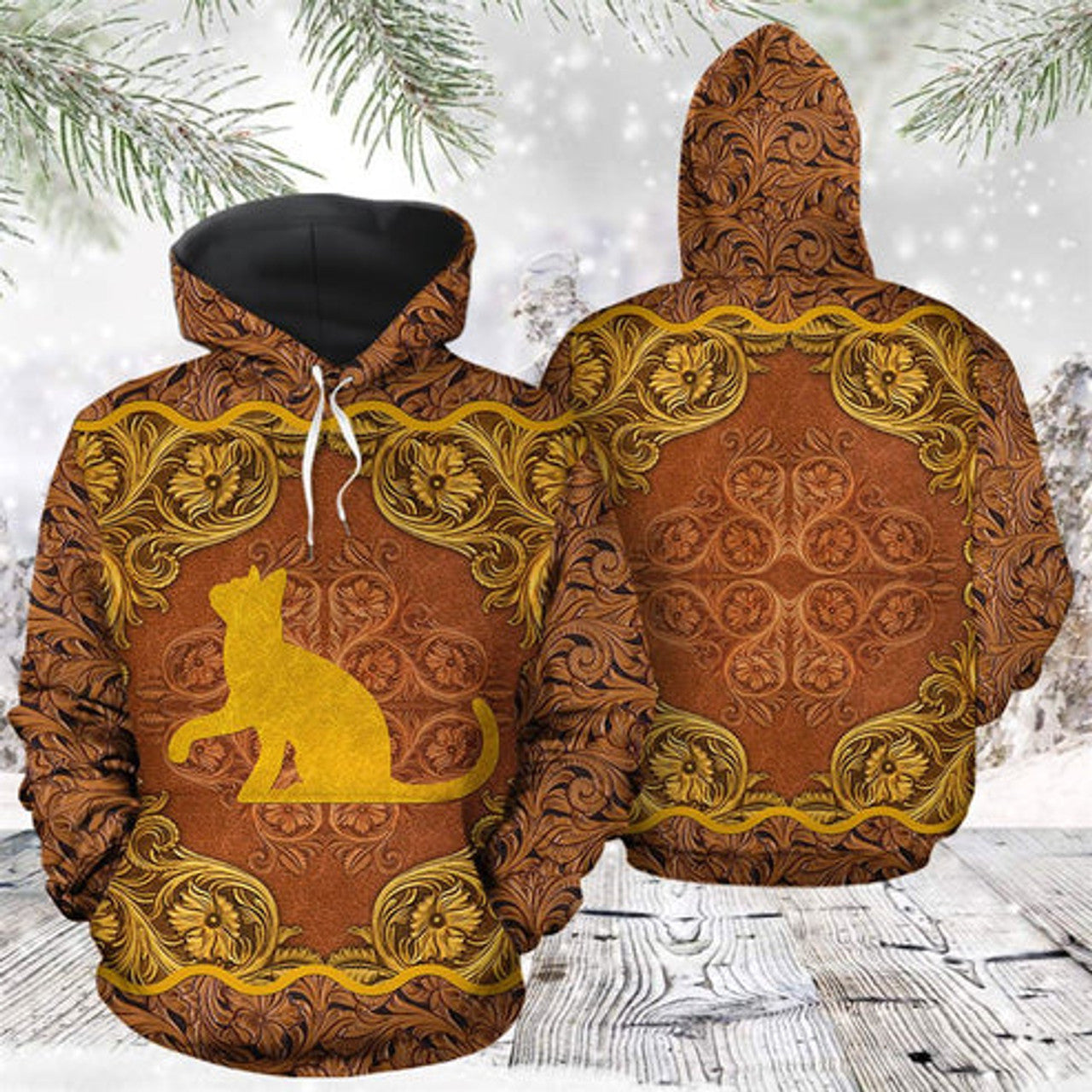 FUNSTUFFPRINT 3D Love Cat Antique Golden All Over 3D Hoodie and Zip Hoodie