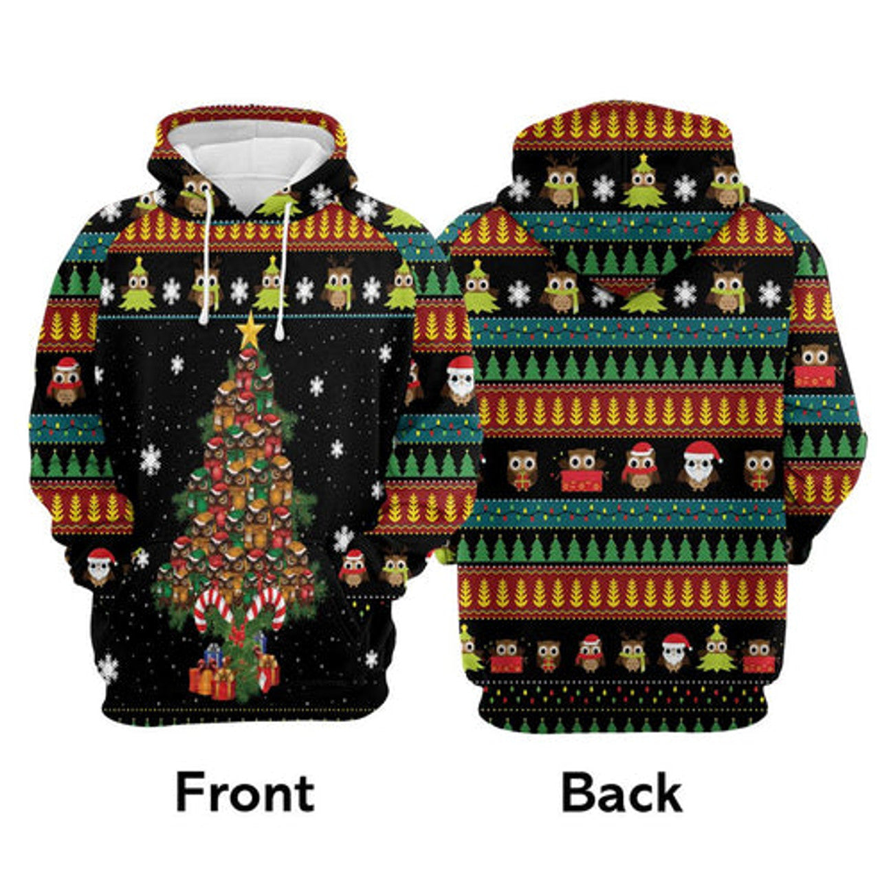 FUNSTUFFPRINT 3D Owl Christmas Tree All Over 3D Hoodie and Zip Hoodie