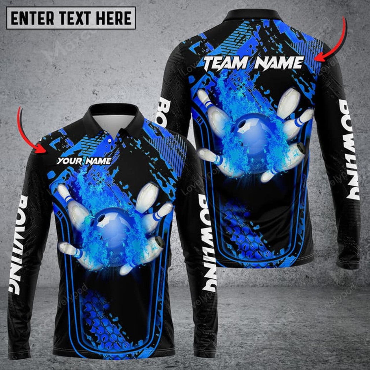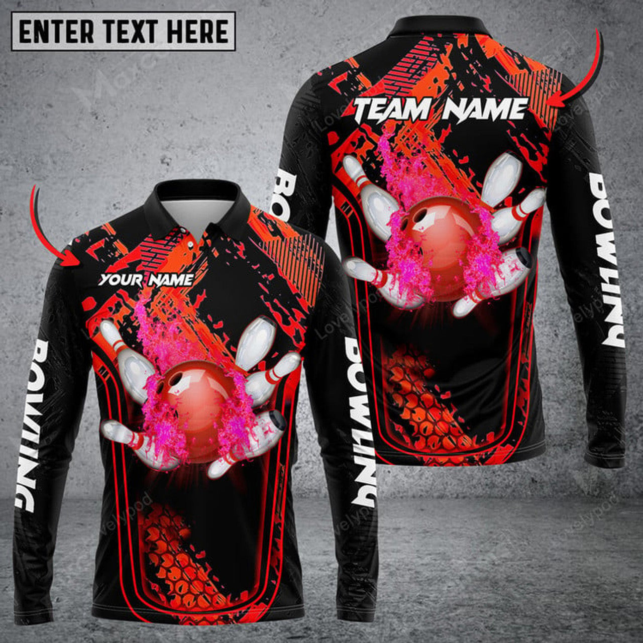 FUNSTUFFPRINT Bowling And Pins Abstract Grunge Texture Multicolor Custom Name Long Sleeve Polo Shirt, Men Bowling Shirts