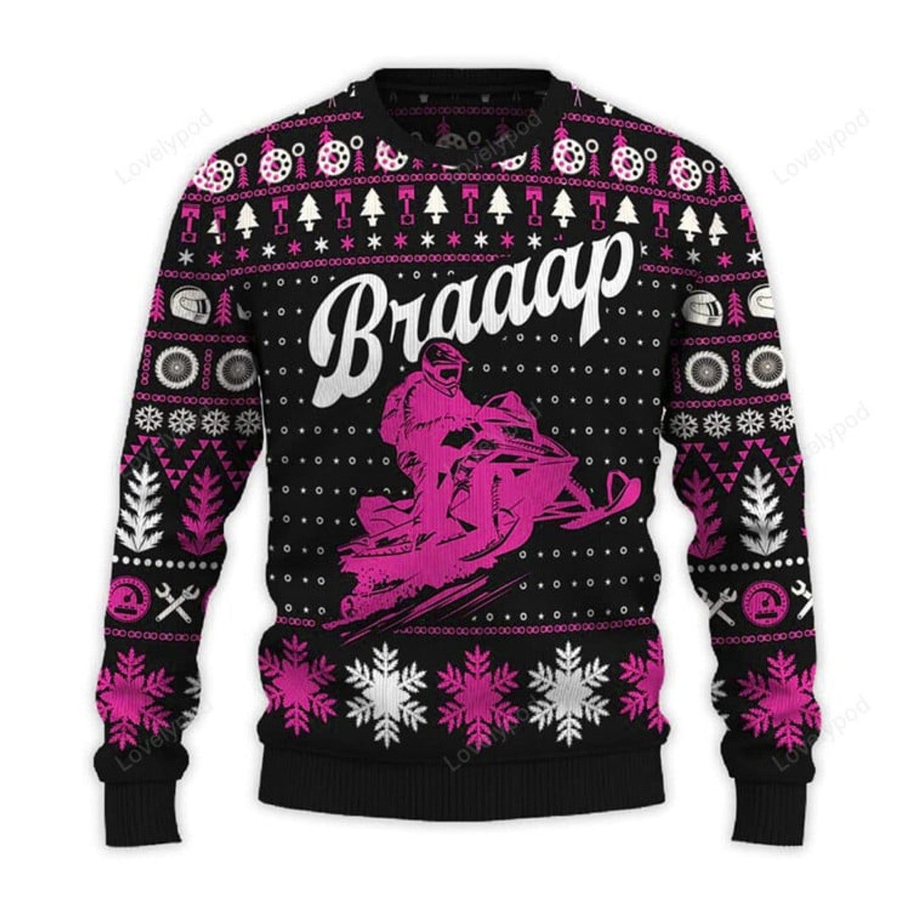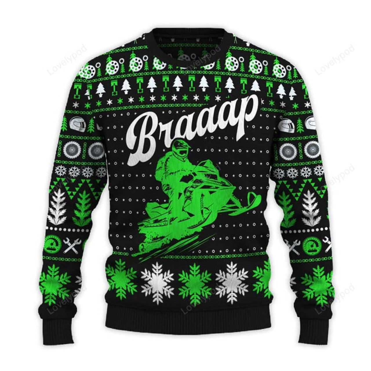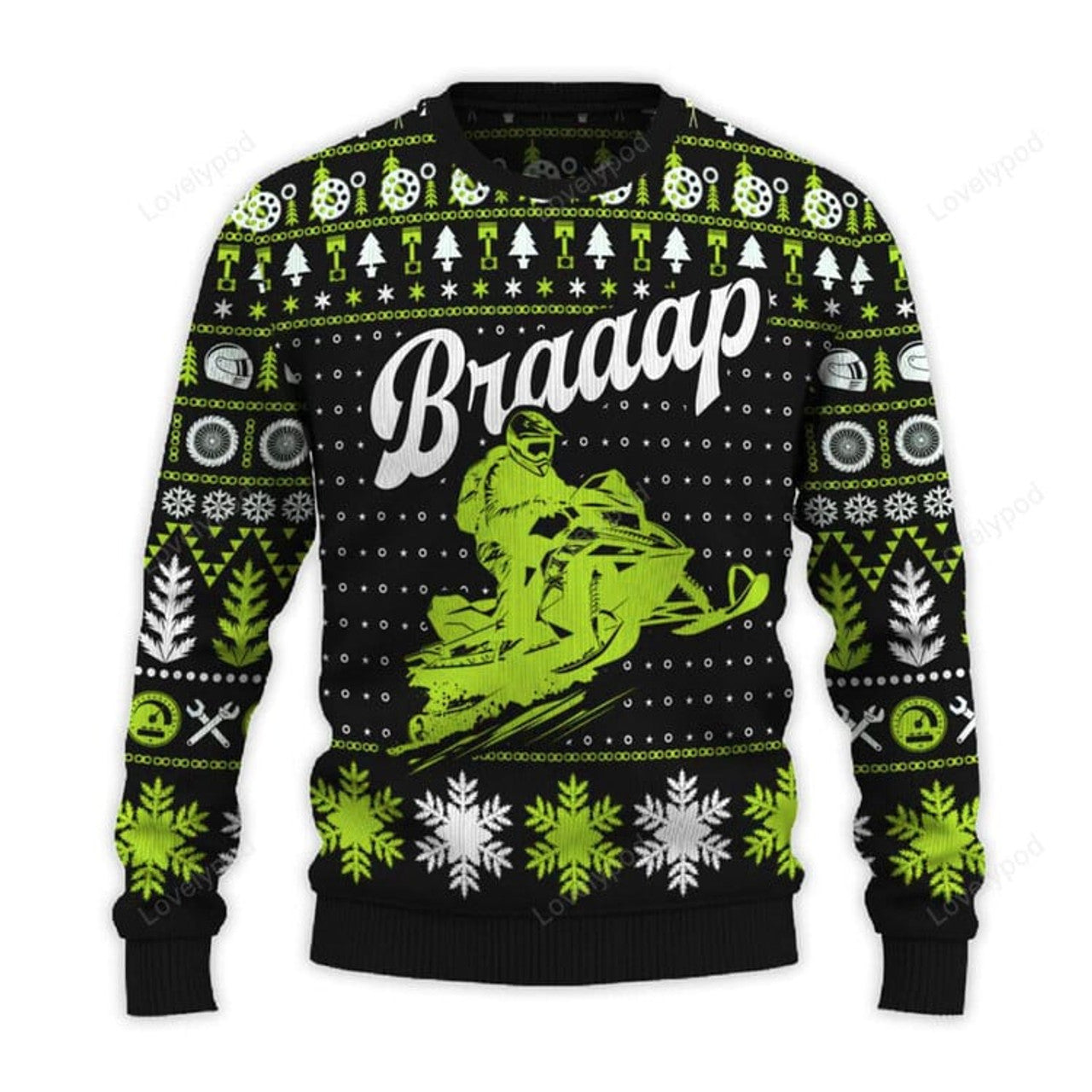 FUNSTUFFPRINT Braaap Snowmobile Ugly Christmas Sweater, Custom Sport ugly sweater, Snowmobile shirt for men and women Ugly Sweater