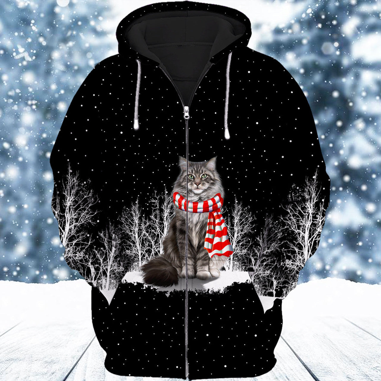 FUNSTUFFPRINT Cat Maine Coon And Winter Night 3D Hoodie and Zip Hoodie
