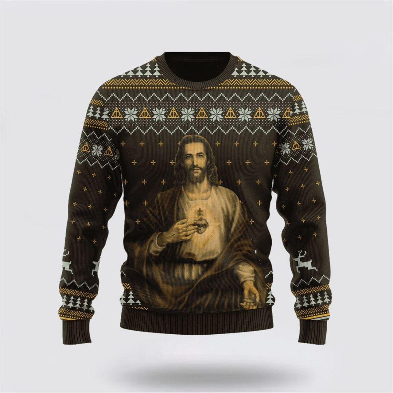 FUNSTUFFPRINT Christian Ugly Christmas Sweater, God Christ Show His Sacred Heart Ugly Christmas Sweater, Religious Christmas Sweaters Ugly Sweater
