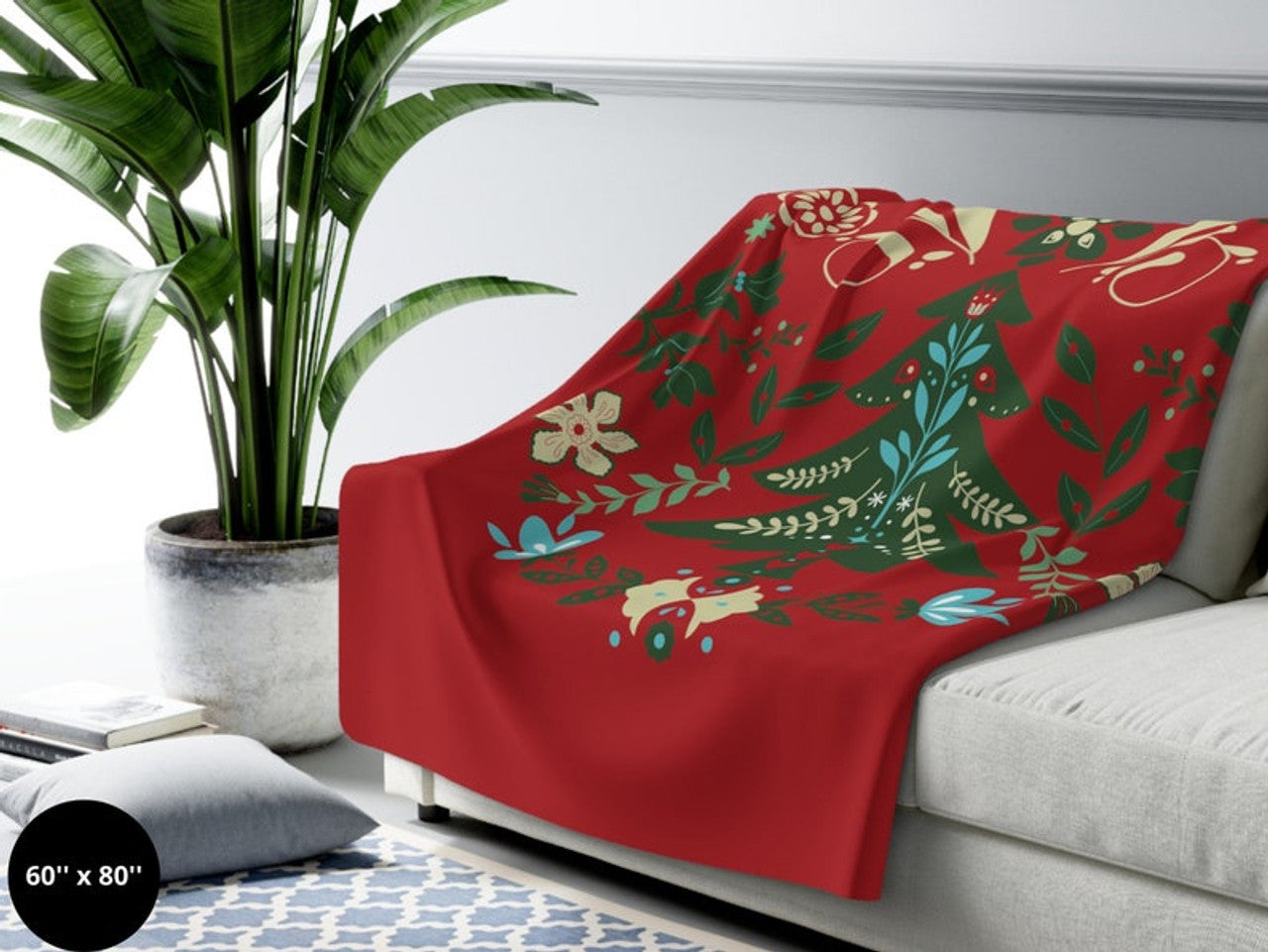 FUNSTUFFPRINT Christmas Blanket| Norwegian Throw Blanket |Norwegian Christmas Tree Blanket| Swedish Folk Art Gift |Nordic Home Decor