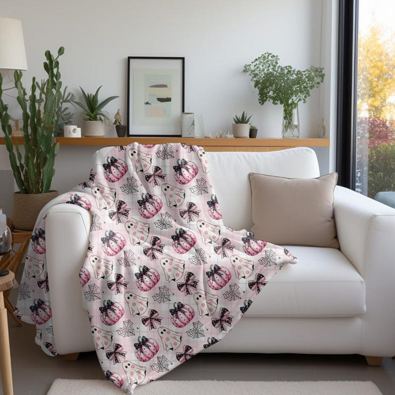 FUNSTUFFPRINT Cozy Velveteen Trendy Ghost Blanket | Fall Spooky Season Home Decor | Preppy Halloween Room Decor | Plush Throw Blanket for Dorm Room