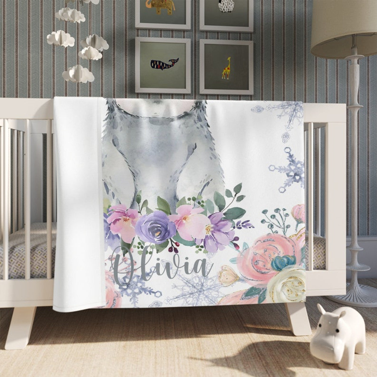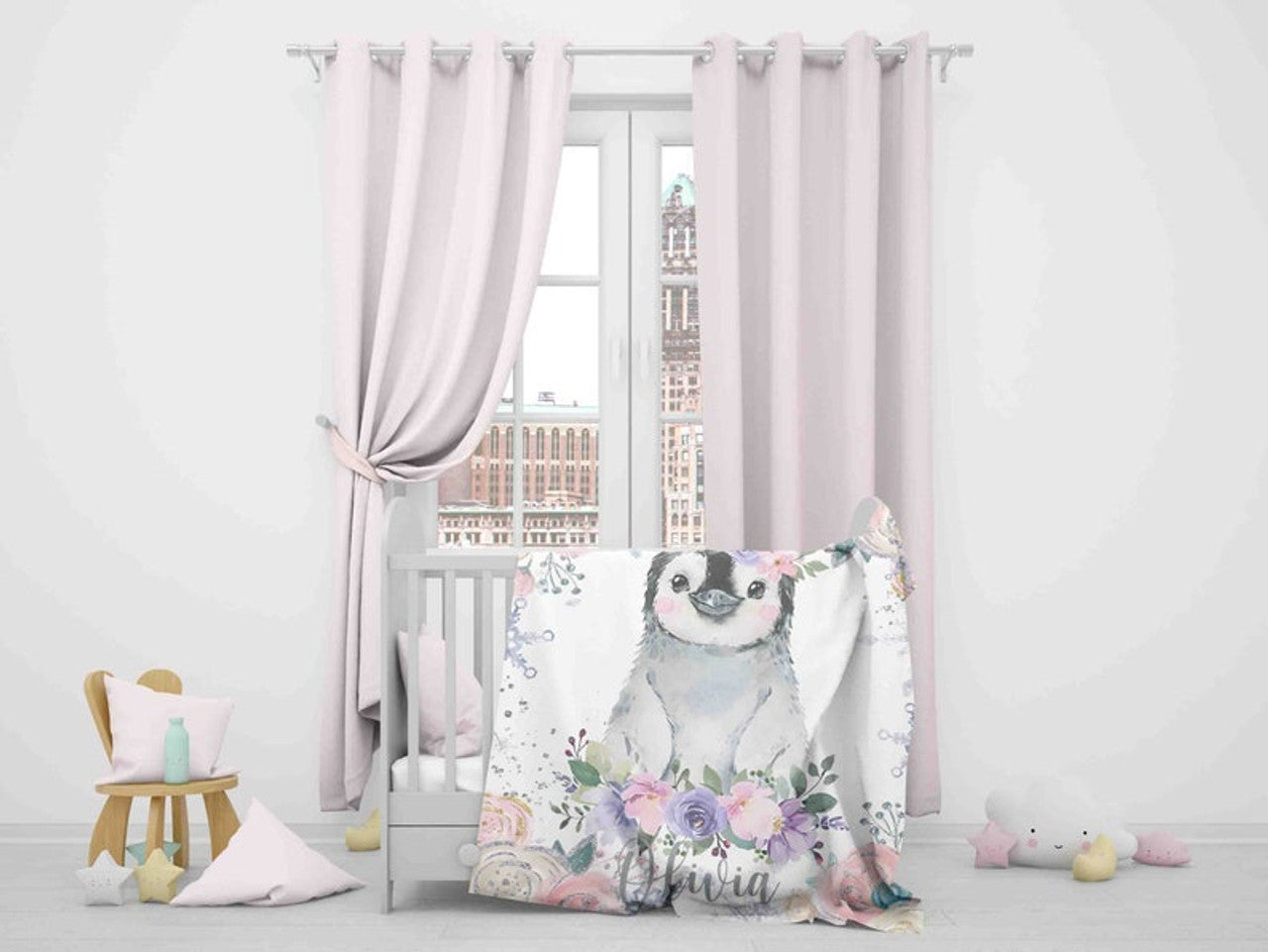 FUNSTUFFPRINT Custom Baby Penguin Blanket, Winter Floral Penguin Nursery Blanket, Christmas Baby Kids Custom Name Blanket, Arctic Baby Shower Gift