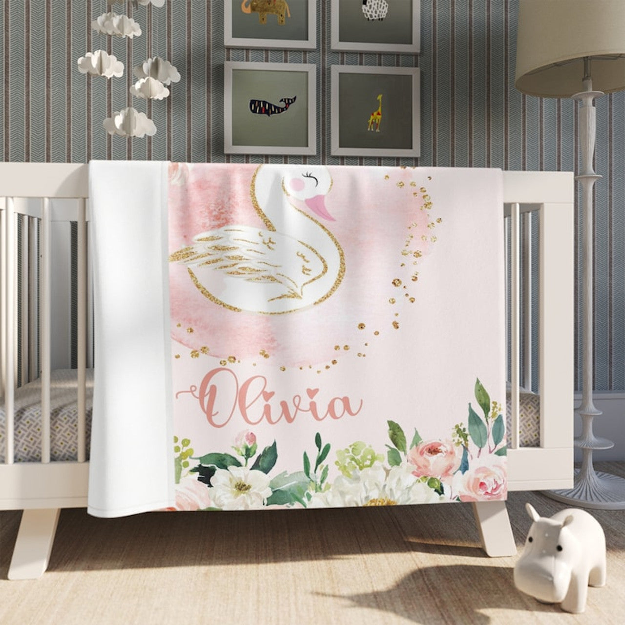 FUNSTUFFPRINT Custom Baby Swan Blanket Personalized Christmas Nursery Blanket Little Swan Kids Custom Name Blanket Spring Floral Baby Shower Gift For Girls