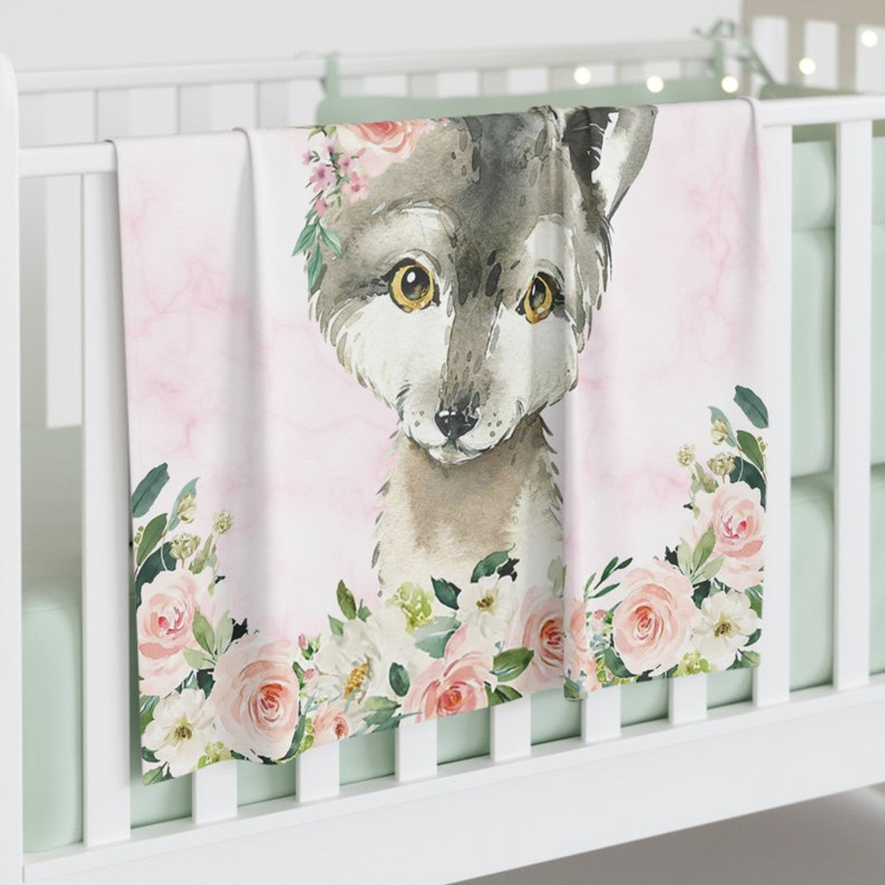FUNSTUFFPRINT Custom Baby Wolf Blanket Personalized Animals Nursery Blanket Rose Flowers Kids Custom Name Blanket Spring Floral Baby Shower Gift For Girls