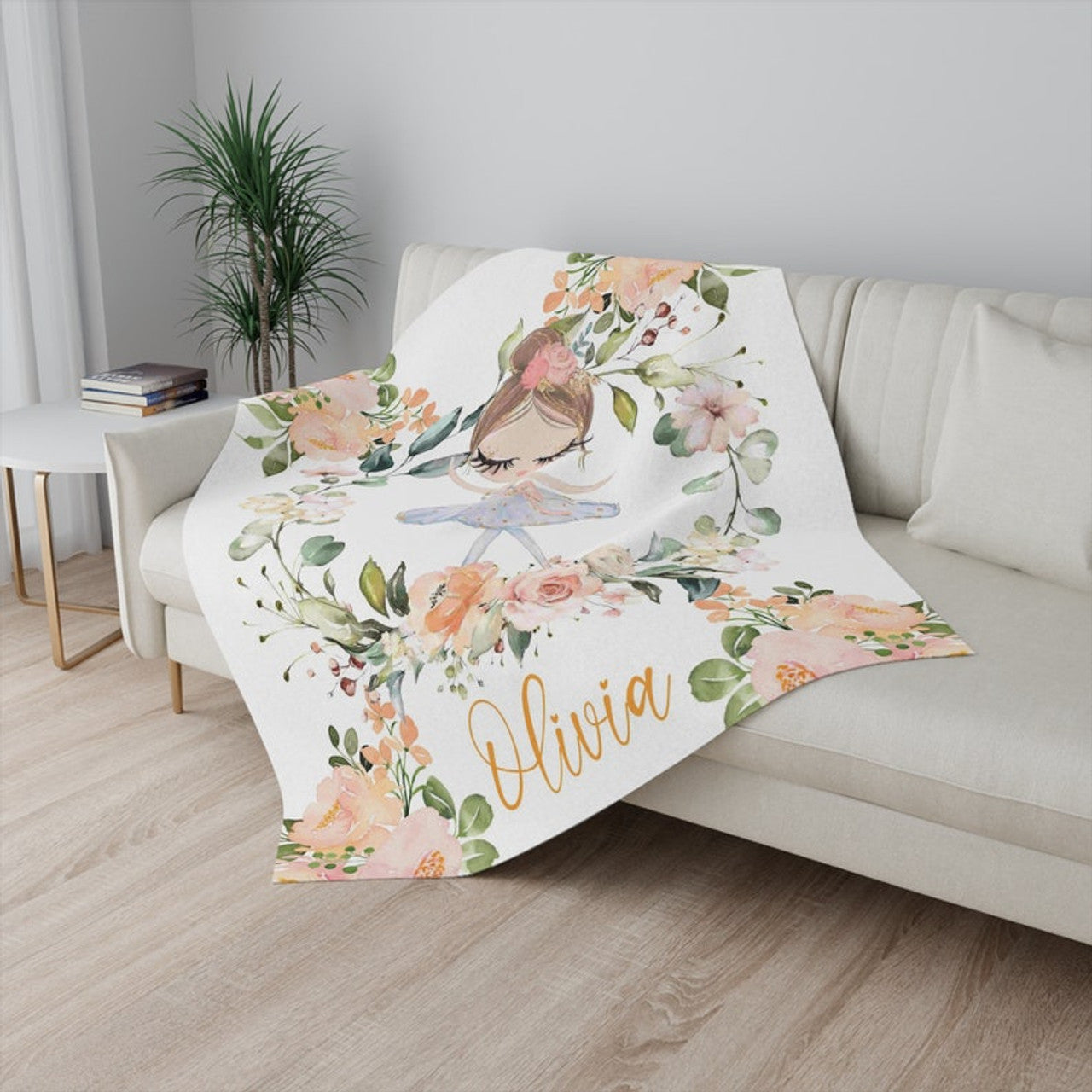 FUNSTUFFPRINT Custom Ballerina Blanket, Ballet Girl Nursery Blanket, Personalized Dancer Gift, Flowers Baby Blanket, Kids Custom Blanket, Floral Baby Shower Gift