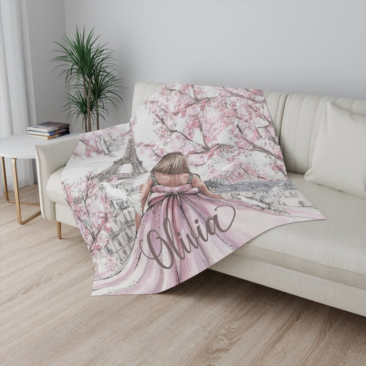 FUNSTUFFPRINT Custom Cherry Blossom Blanket Personalized Blanket Paris Girl Custom Name Blanket France Travel Blanket Eiffel Tower Gift For Her Valentines Gift