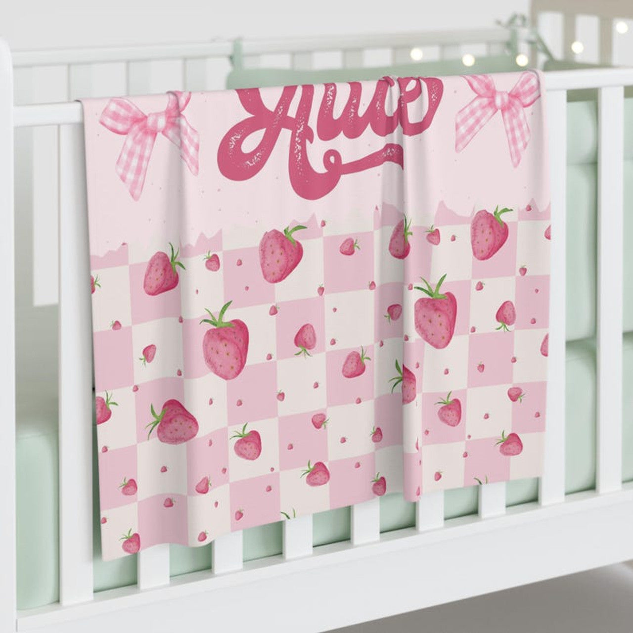 FUNSTUFFPRINT Custom Coquette Strawberry Nursery Blanket Pink Bow Custom Baby Name Blanket Kids Custom Name Blanket Baby Girl Gift For Daughter Fruit Lover Gift