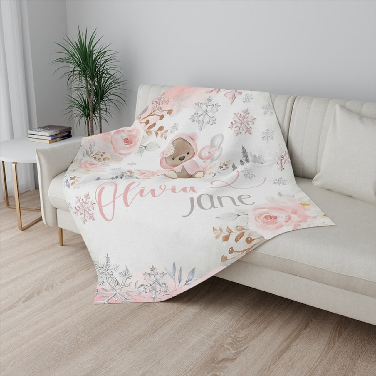 FUNSTUFFPRINT Custom Floral Teddy Bear Baby Blanket, Winter Snow Nursery Blanket, Xmas Baby Girl Blanket, Personalized First Christmas Gift, Kids Name Blanket