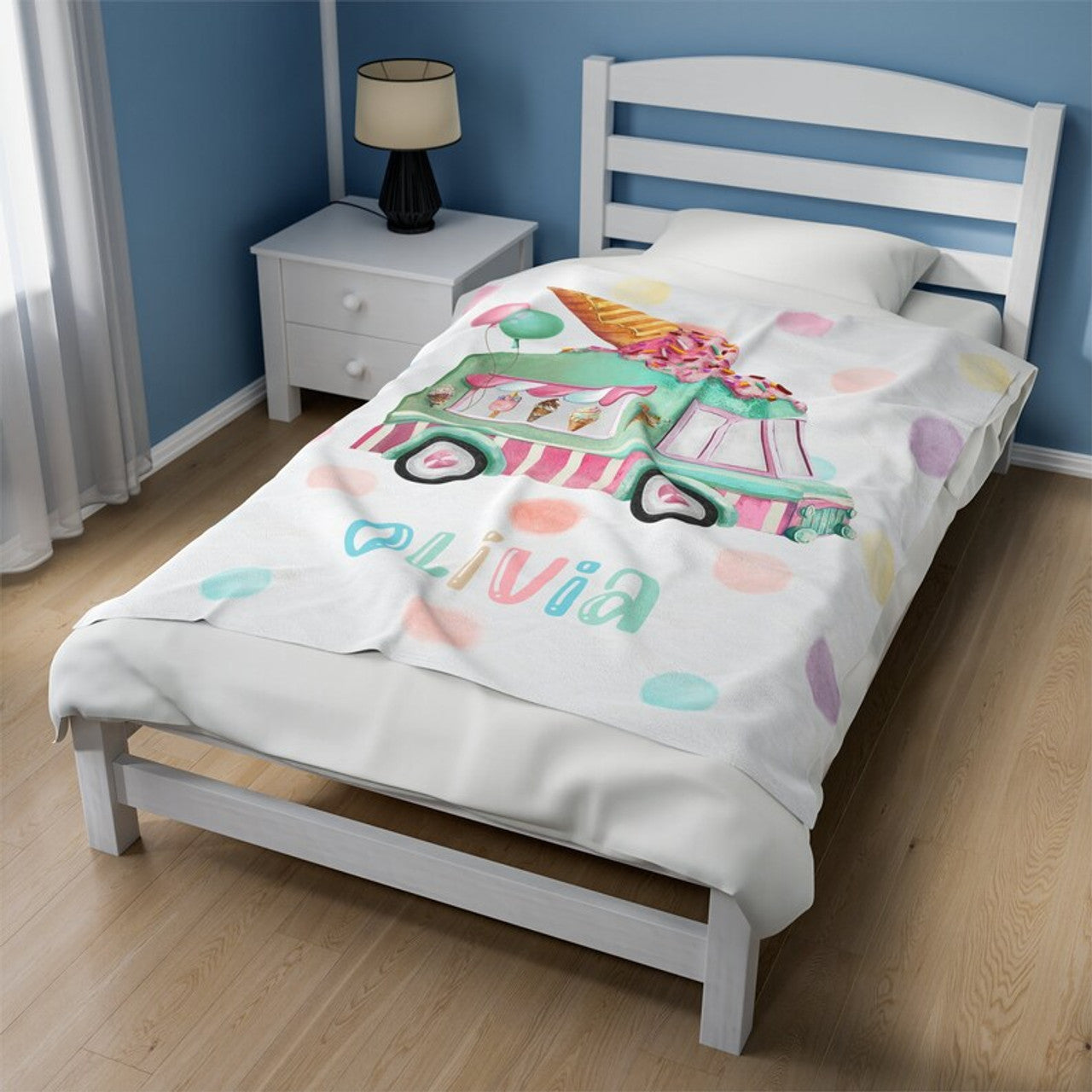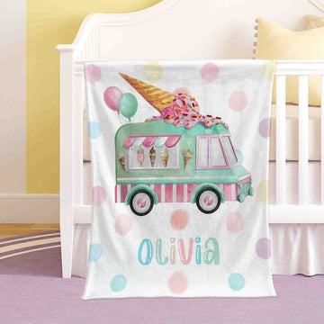 FUNSTUFFPRINT Custom Ice Cream Van Blanket Personalized Summer Nursery Blanket Kids Custom Name Blanket Summer Vacation Present Baby Shower Gift For Girls