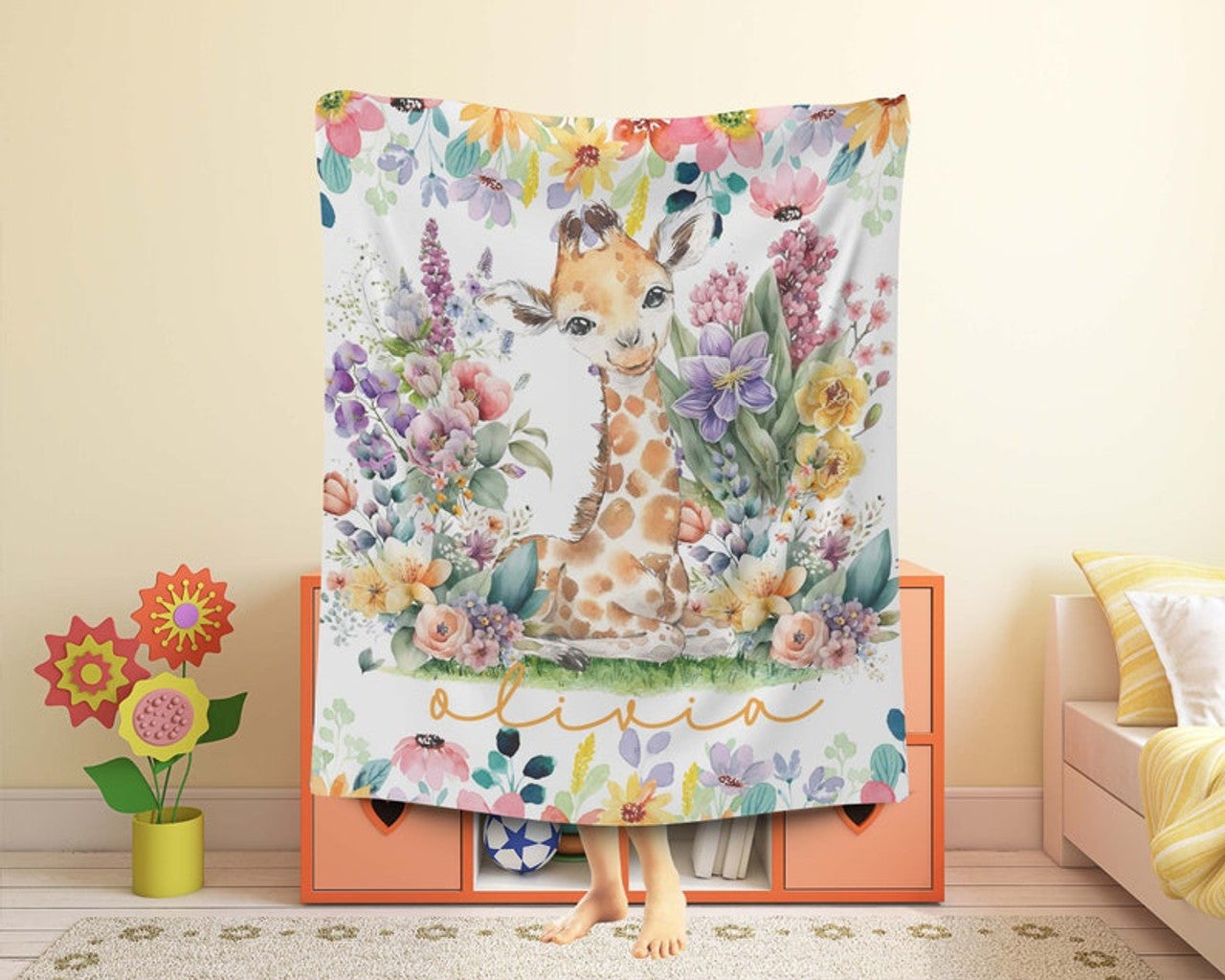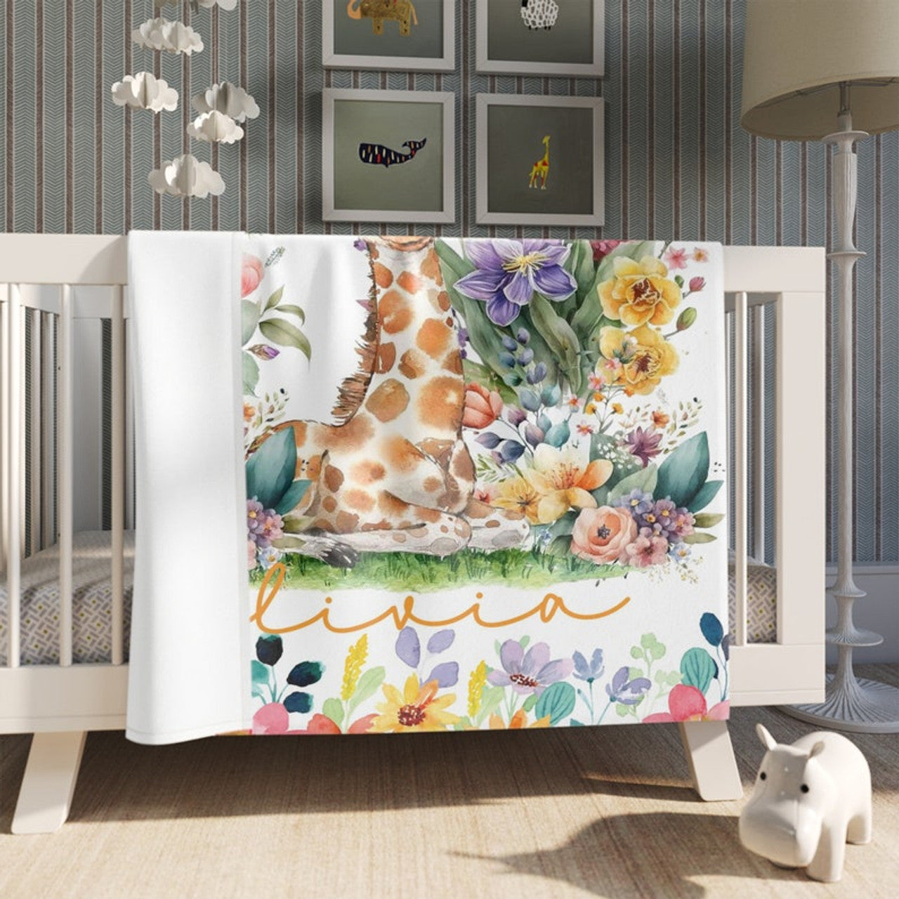 FUNSTUFFPRINT Custom Little Giraffe Baby Blanket, Colorful Floral Nursery Blanket, Personalized Jungle Animal Blanket, Kids Custom Name Blanket Baby Shower Gift