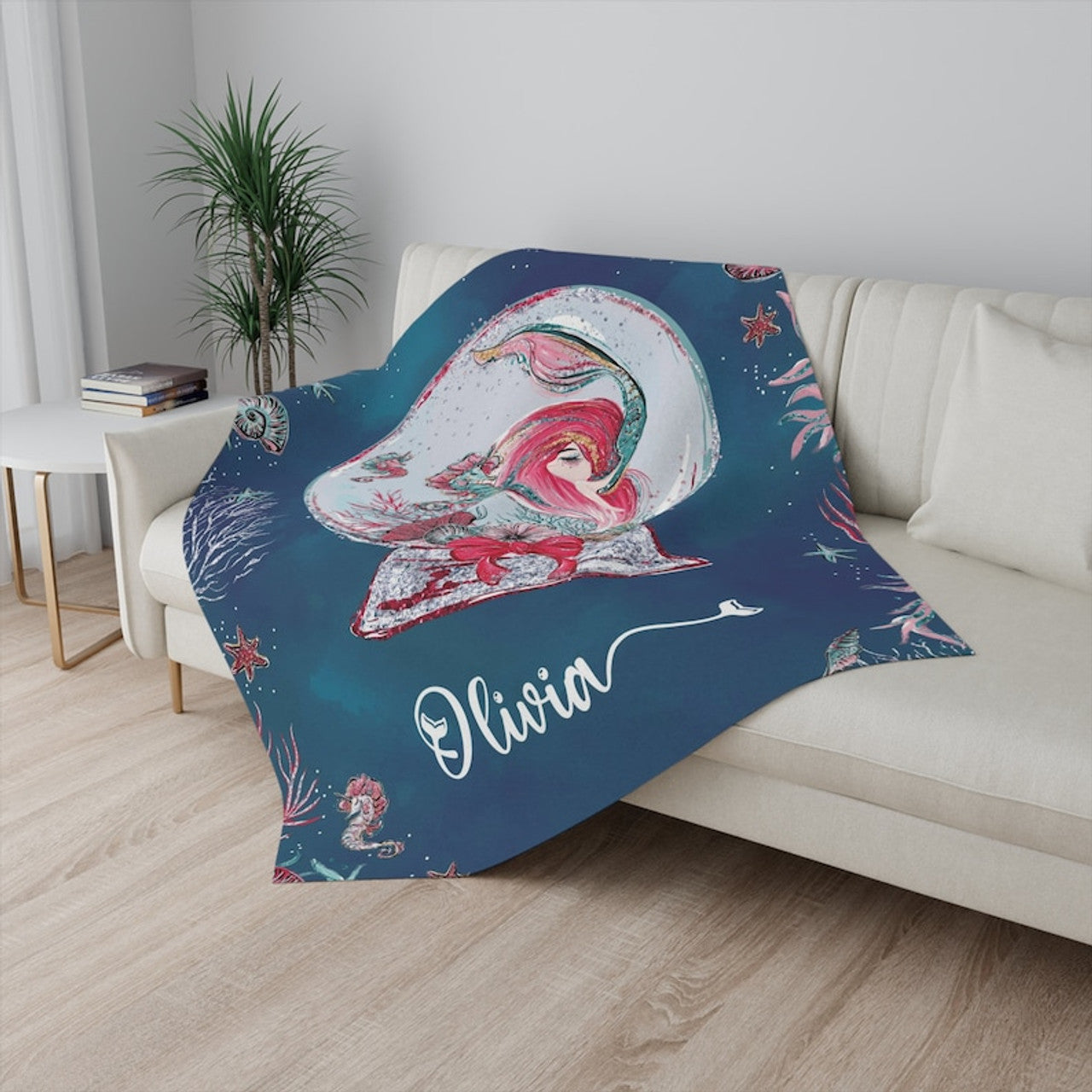 FUNSTUFFPRINT Custom Little Mermaid Nursery Blanket Personalized Snow Globe Blanket Baby Mermaid Kids Custom Name Blanket Ocean Baby Shower Gift Christmas Throw