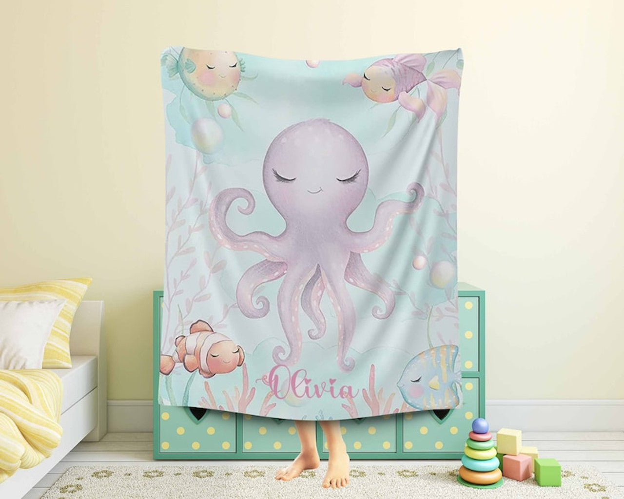 FUNSTUFFPRINT Custom Little Octopus Blanket Personalized Ocean Animal Nursery Blanket Sea Animal Kids Custom Name Blanket Ocean Baby Shower Gift Christmas Throw